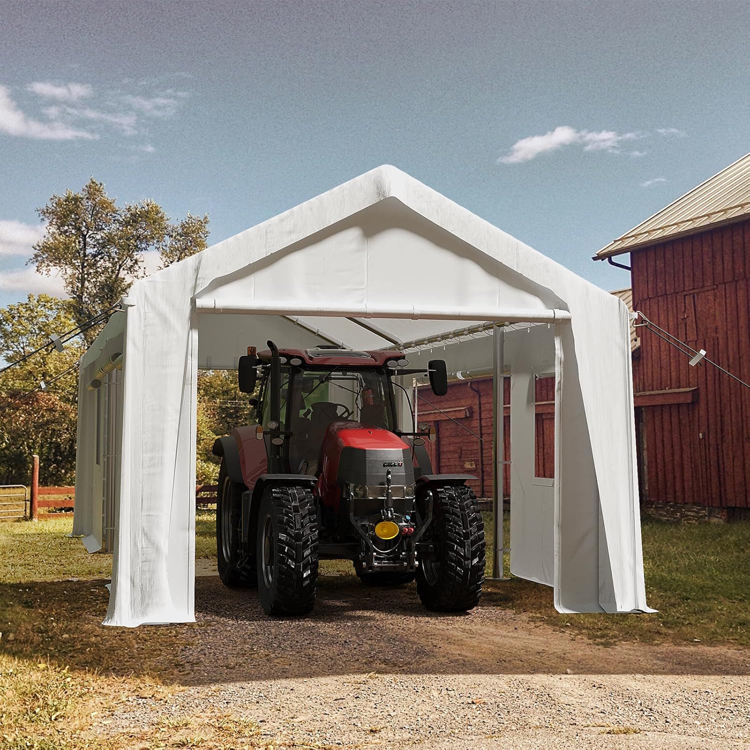 12x20ft Heavy Duty Carport Outdoor Canopy Portable Garage with 4 Doors & 4 Windows Waterproof UV Resistant Storage Shelter with Removable Sidewalls for Car Truck Boat, White