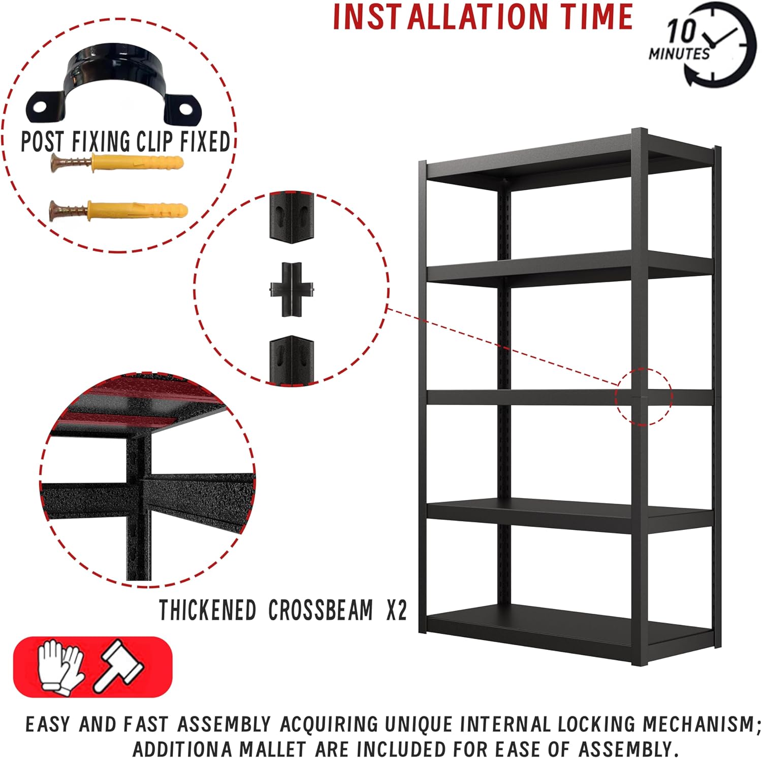 - Easy and fast assembly Acquiring unique internal locking mechanism, it takes less than 5- 10 minutes to fully assemble this shelves for storage, read the manual and finish in top notch speed. Additional gloves and mallet are included for ease of assembly.