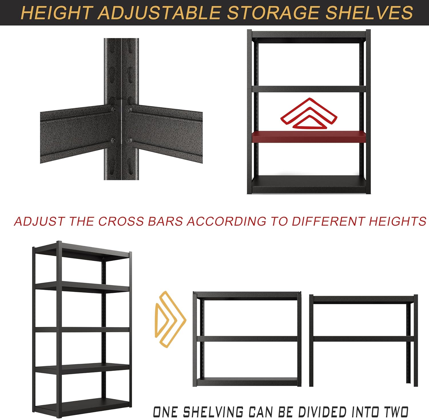 - Adjustable and Dividable Design Heavy Duty Shelf Depending on what you intend to store, adjustable heights allow you to gain more or less space between tiers. And it also can be divided into 2 different shelves, which provides more flexibility and meets your DIY needs at the same time. Additional foot pads are included to protect your floor after divided.