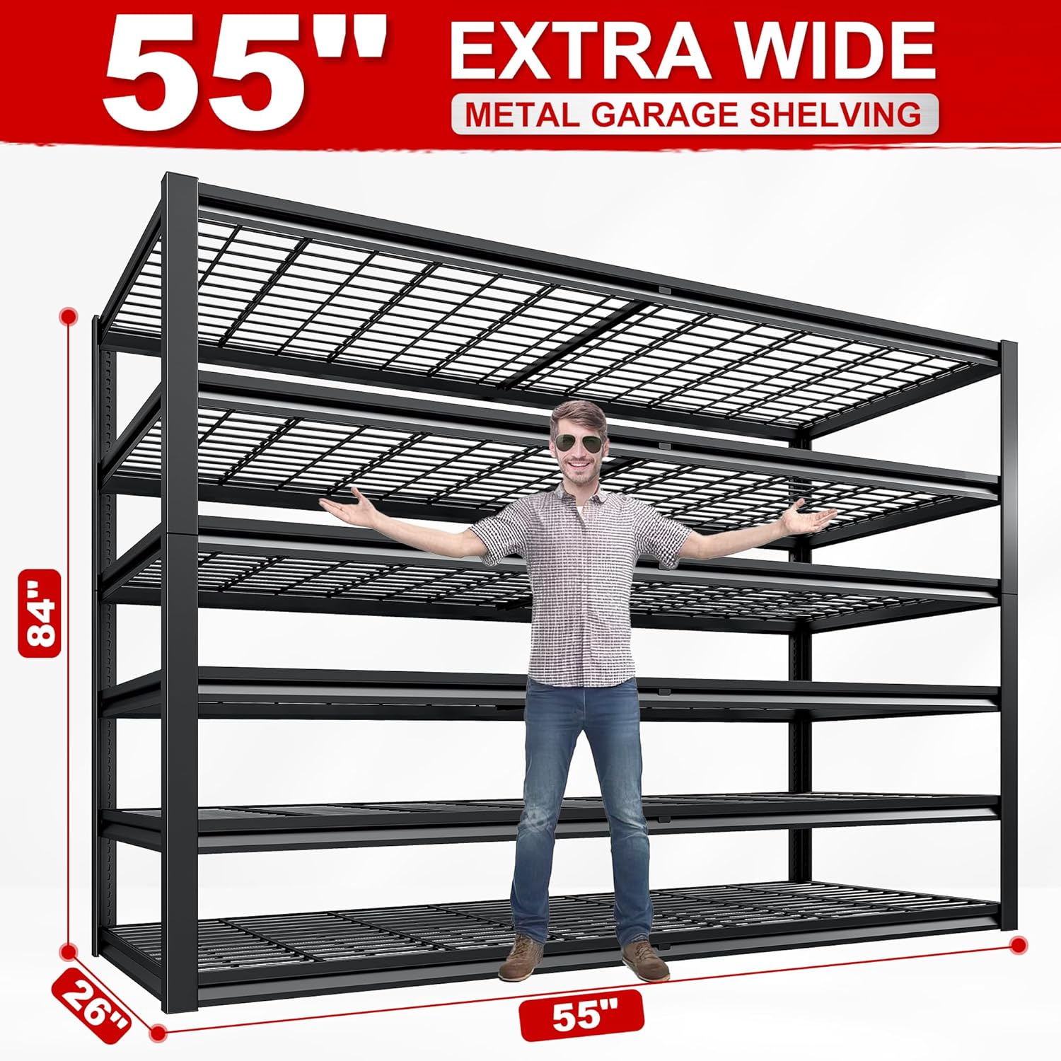 - 【6 Tier Large Garage Shelving】REIBII Garage Shelving Unit's (55"W x 26"D x 84"H) 6-tier design provides you with ample space to store bulky items, like storage bins, tools, heavy totes, machinery, tires, and other equipment. This heavy-duty metal shelving is a premium choice for garages, warehouses, offices, kitchens or any room requiring robust organization