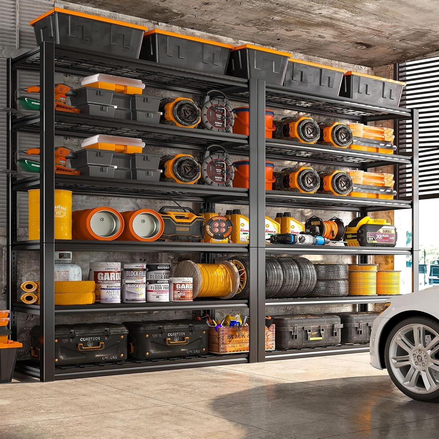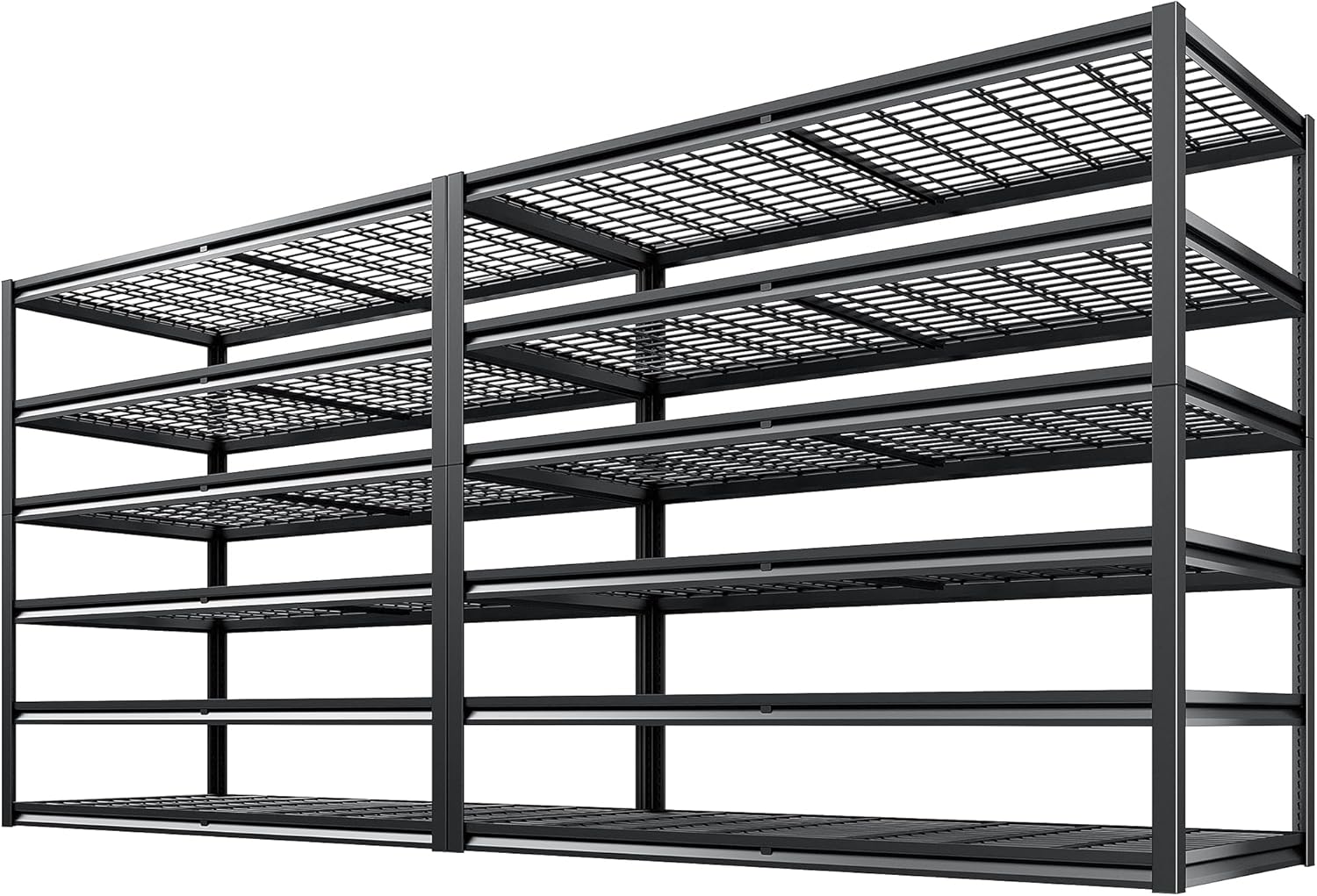 - 【3500LBS High Capacity Storage Shelves Heavy Duty】The combination of thickened wire mesh and reinforced double-layer columns delivers an ultra-high load capacity of 3,500 lbs. Rest assured when storing heavy items like toolboxes, vehicle parts, files, dumbbells, or office supplies. These heavy-duty storage shelves support up to ten 27-gallon totes per tier