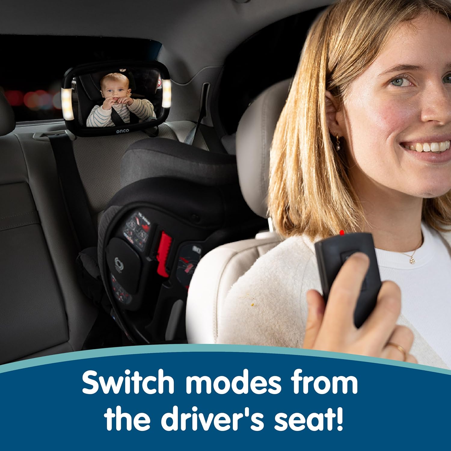 - REMOTE CONTROLLED*: Turn the remote-controlled baby backseat mirror on and off and switch between the 2 light modes from the comfort of the driver's seat. This LED mirror is one of those baby accessories for car journeys you won't want to go without! *Batteries not included.