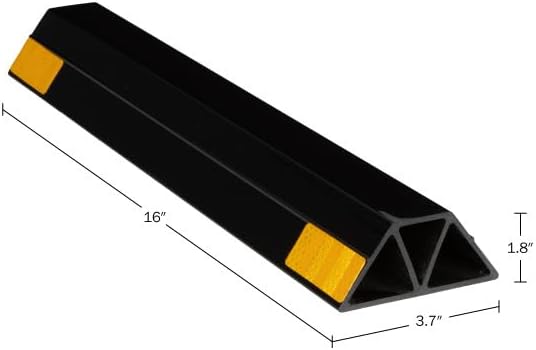 - PRODUCT DETAILS - Materials: Molded Hardened Plastic. Dimensions: (L) 16” x (W) 3.7” x (H) 1.8”; Weight: 3.31lbs. Set of 2 Wheel Stops for Garage. Color: Black with Yellow Visibility Stripes.