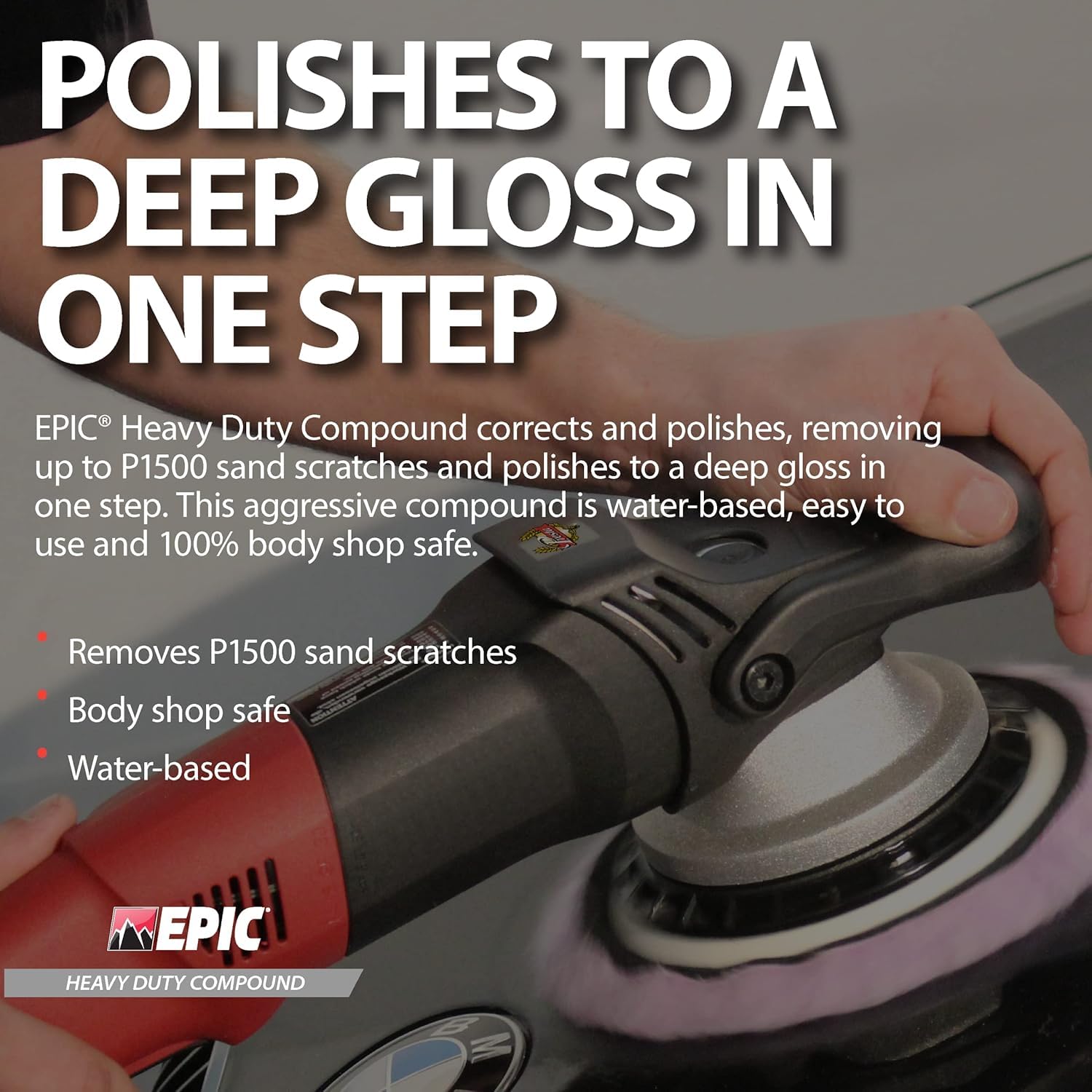 - DUST-FREE, SWIRL-FREE CAR COMPOUND: The EPIC Heavy-Duty Compound offers a dust-free application, keeping your workspace clean and efficient. It provides a swirl-free finish when used with the correct orbital pad, such as the Epic Purple Wool Heavy Duty Pad or the EPIC Gray Foam Heavy Duty Pad. This car buffing compound ensures that your vehicle's paint remains smooth and shiny without any unsightly swirl marks, delivering a professional grade result every time.