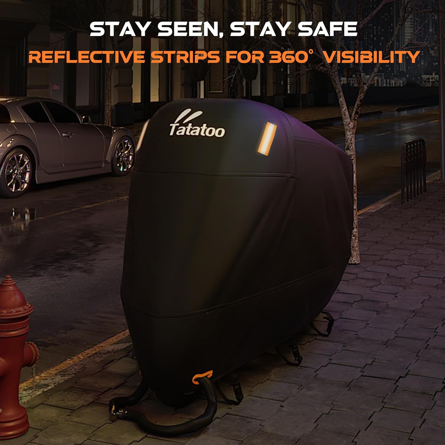 - 【Windproof & Secure Fit】TATATOO has uniquely designed windproof buckles at three strategic points (front, middle, and rear) along the bottom hem of the cover to resist strong winds. This ensures the cover fits securely over your motorcycle, preventing it from blowing away, even on windy days. Ideal for cruisers, dirt bikes, or mopeds, this innovative design gives you confidence when leaving your bike outdoors.