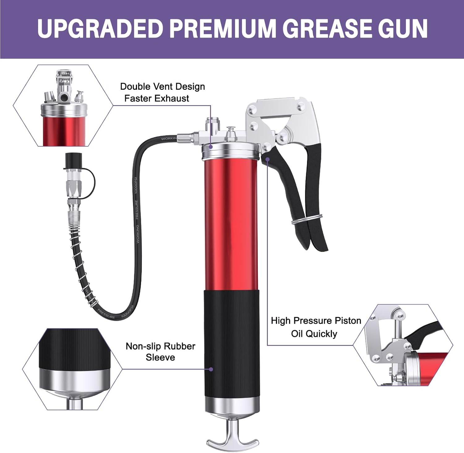 8000 PSI Heavy Duty Grease Gun Kit - 14oz with Flex Hose, Sharp Nozzle, Extension Pipe & Coupler, Red