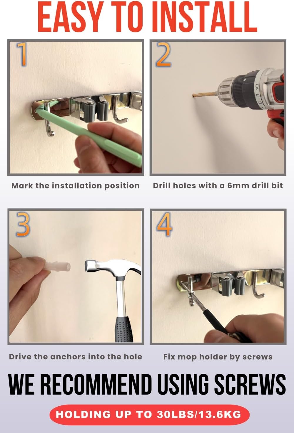 - STURDY: The broom organizer wall mount is made of premium quality stainless steel which is stronger than plastic material, corrosion-resistant, rustproof and waterproof. Broom and mop holder can hold items up to 30 lbs