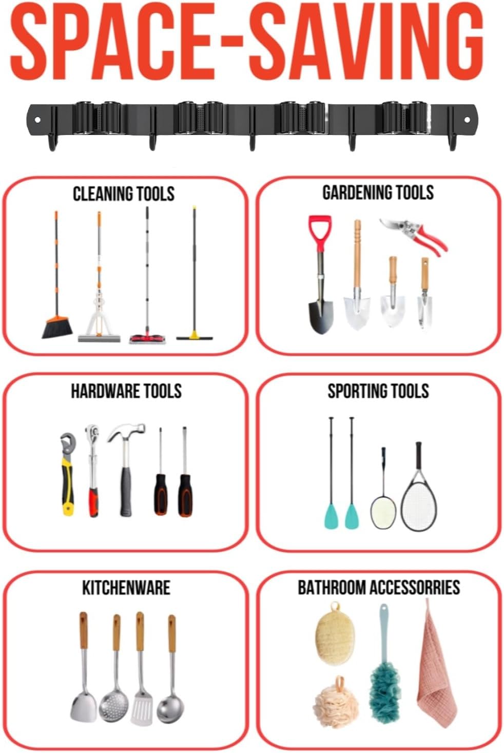 - SAVE SPACE: The wall hangers for brooms and mops provides you easy access to store and grab brooms, dustpans, mops. This tool organizer with 5 gripers and 4 utility hooks allows you to hold brooms, mops, brushes, rakes, garden tools, etc