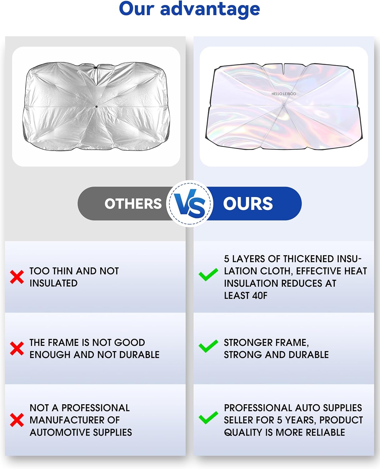 - ใCOLLAPSIBLE 360-DEGREE BENDING STORAGEใ: This car windshield sun shade can be opened quickly, and it is easy to install our car window covers perfectly without tools. The car sun shade windshield of this car awning is designed with a "memory steel ring", which can be twisted and folded 360ยฐ freely, and can be conveniently stored in a leather storage bag when not in use, and placed in the door storage box or storage box to avoid debris accumulation