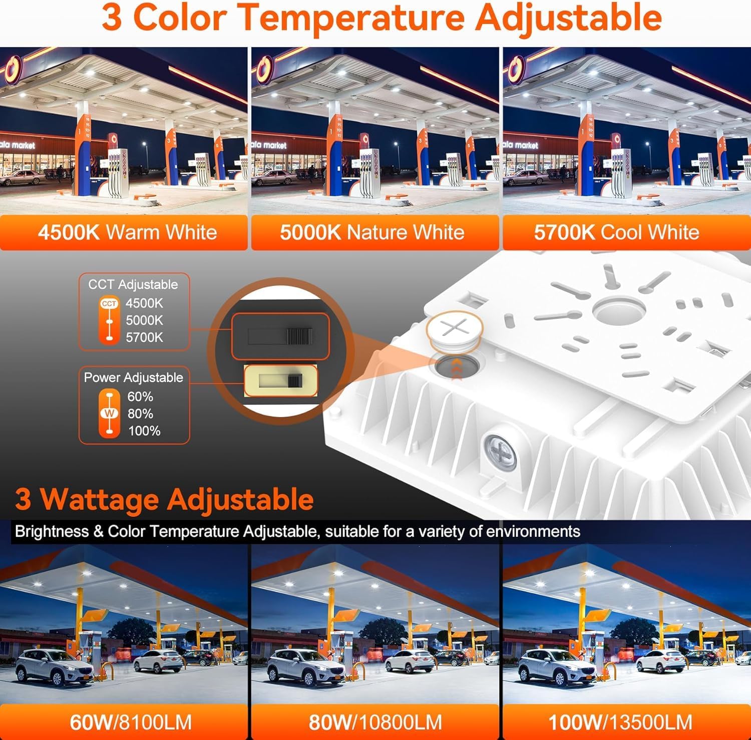 - 【3 Power & 3 Color CCT Adjustable】BBESTLED canopy light offers CCT and power adjustable functions. The canopy LED light can adjust the colour temperature from 4500K warm white (WW), 5000K neutral white (NW) to 5700K cool white (CW) to meet the lighting needs of different scenarios. The canopy LED light also has three wattage options (A/B/C) for 60W, 80W, 100W that can be adjusted to reduce your power consumption