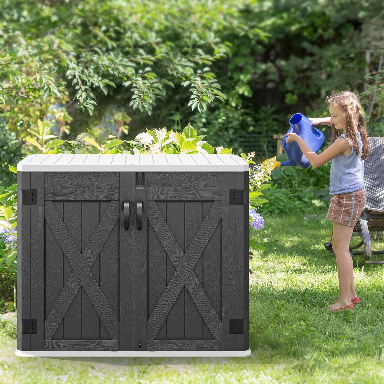 - ALL-WEATHER RESISTANT- This storage shed is made from weatherproof resin for UV protection, all-weather use, easy cleaning and maintenance; Alluring wooden texture will not fade and the innovative lid design keeps water out