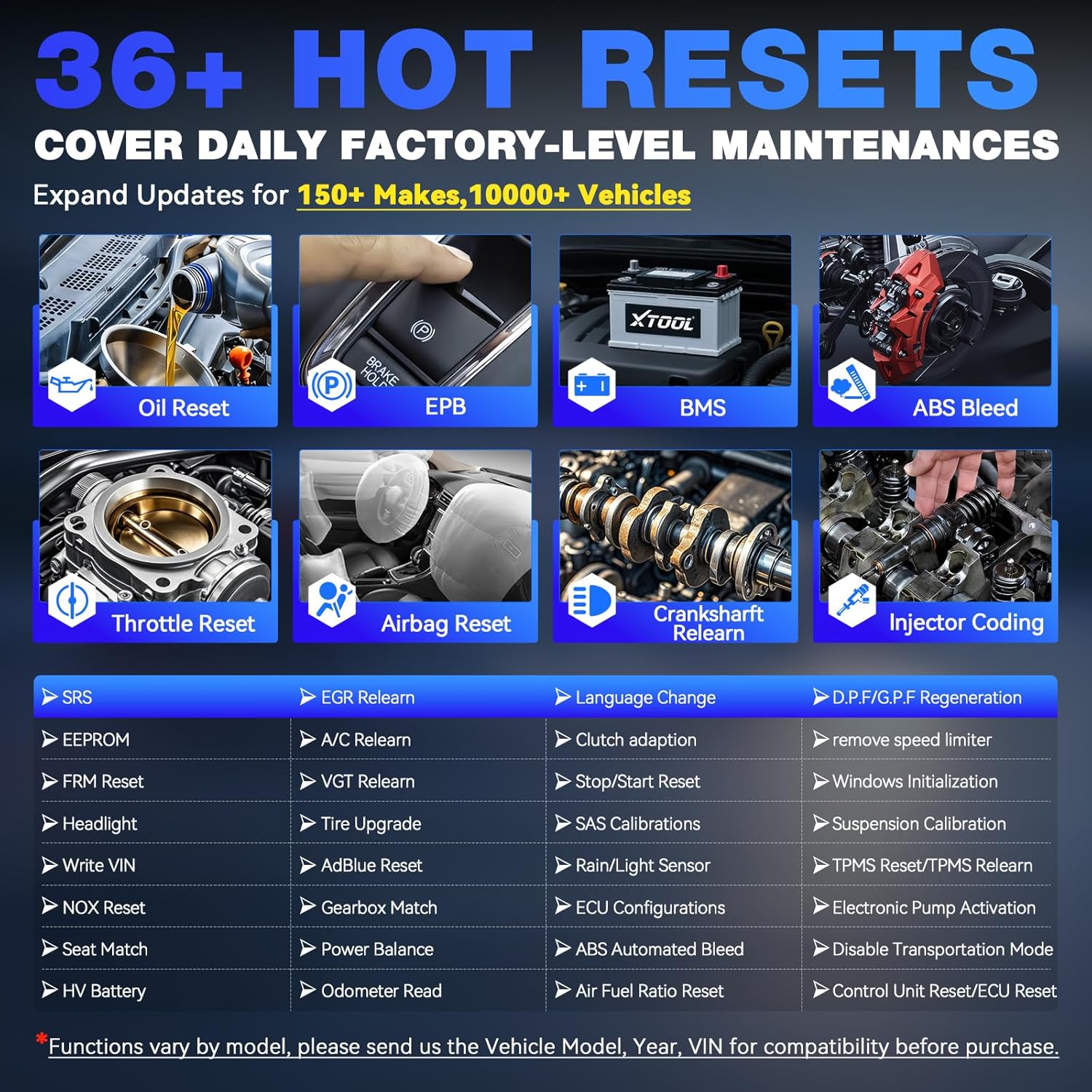 - 36+ Special Functions & Vehicle-Specific Features: The VD70 OBD2 scanner offers 36+ services, including Oil Reset, EPB, BMS, Throttle Adaptation, Injector Coding, ABS Bleed, Crank Sensor Relearn and TPMS Reset. It also provides vehicle-specific functions include reset, adaptation, initialization, and calibration. These capabilities help you perform comprehensive tasks like system reset with ease. Note: Features vary by vehicle make and model. Please check compatibility with your VIN by contacting us at vdiagtool2 @ outlook . c o m before purchase.