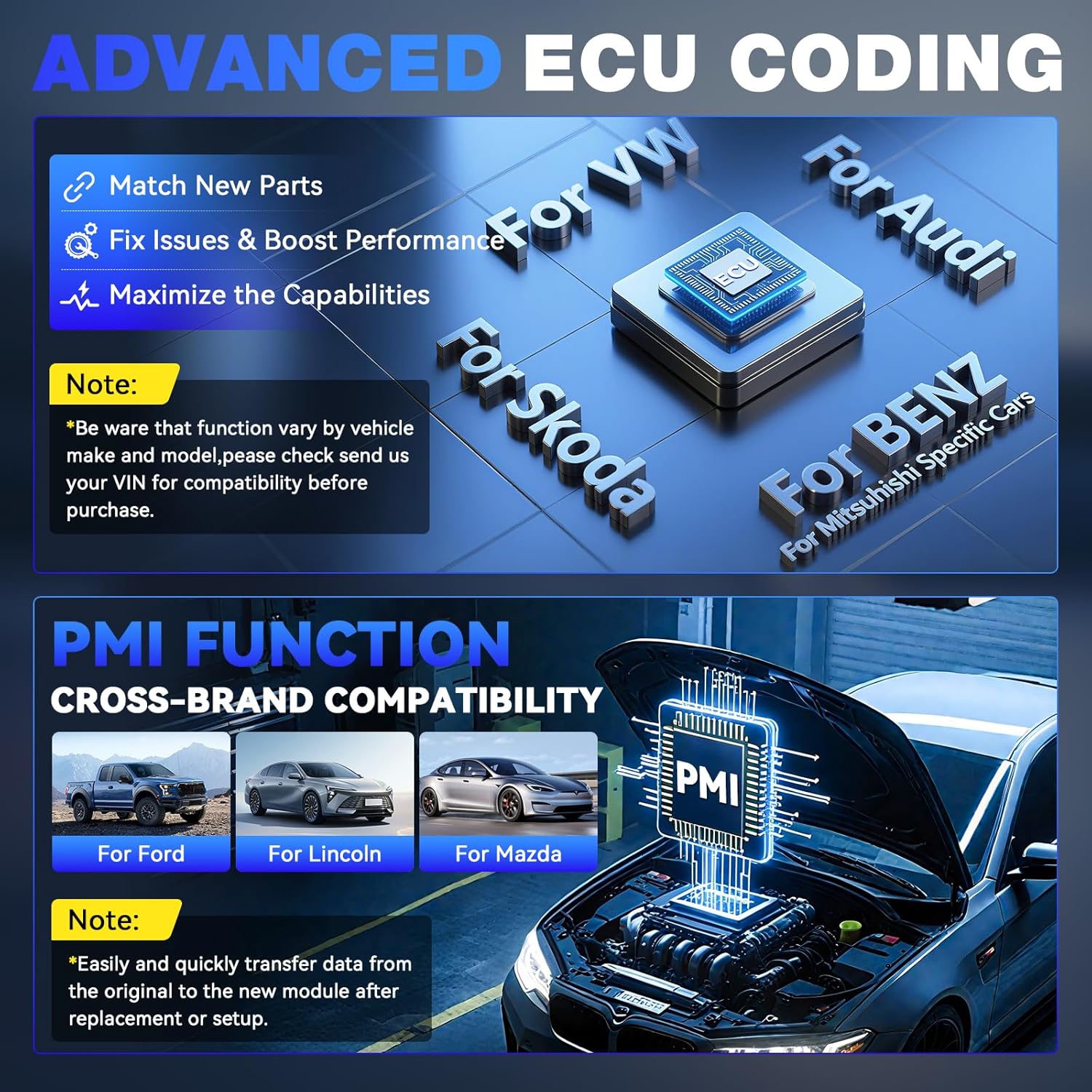 - Advanced ECU Coding & PMI for Specific Brands: This auto diagnostic scanner supports advanced ECU coding for specific european vehicles for VW, for Audi, for Skoda, for Mercedes-Benz, for Mitsubishi. It also enables ecu coding for BMW, for Volkswagen, for Jaguar, and for Land Rover. From coding and component matching to adaptive data resets, this scan tool helps you match new components after repairs or replacements to boost performance. Note: ECU coding functionality varies by vehicle and module, please check the compatibility before order.
