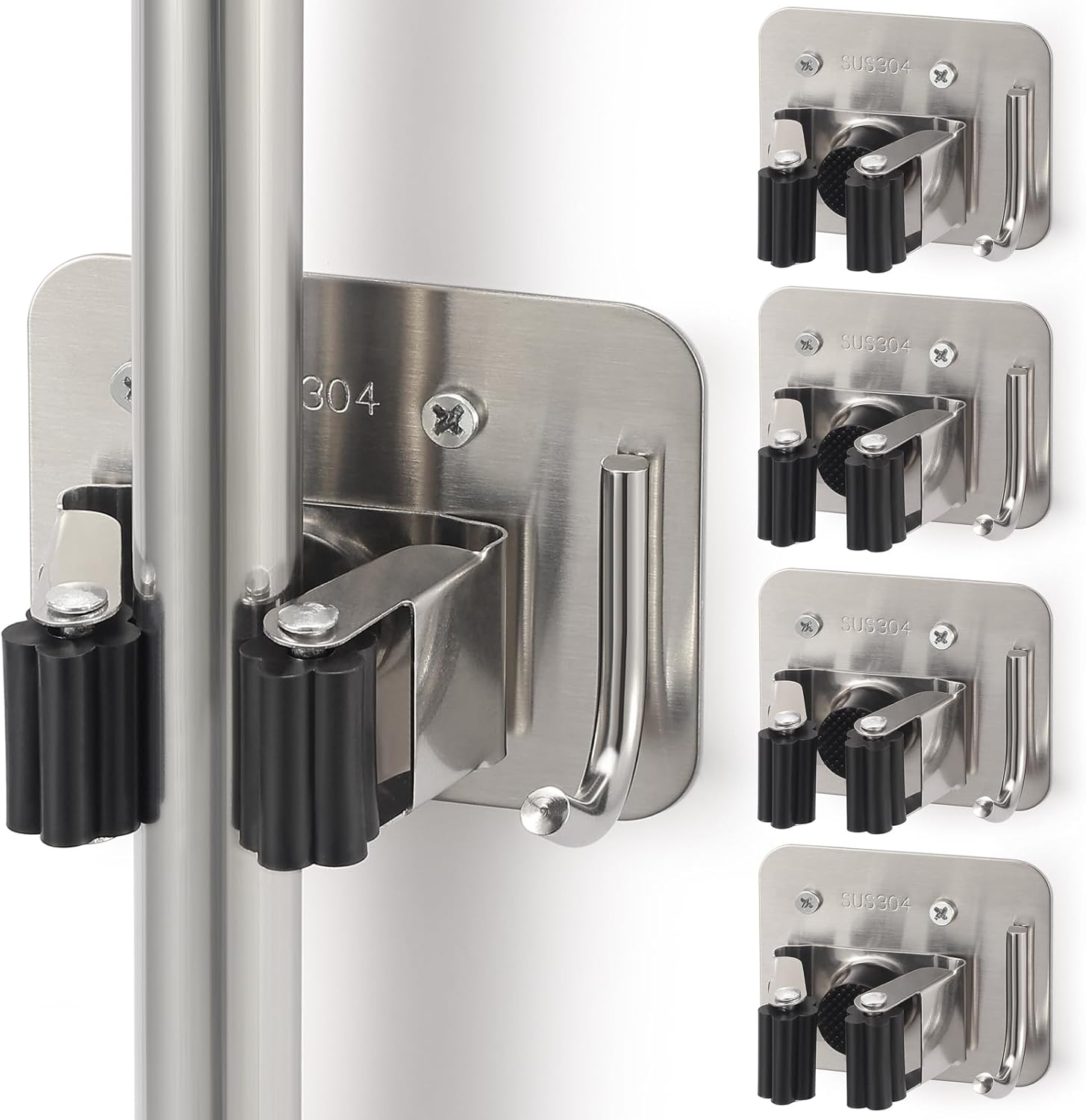 - Rod Holder - Home Improvement Items, Wall Mount Metal Mop and Broom Organizer and Laundry Garden Kitchen Tool Rack, Wall Hanger for Home Goods, 4 Gripper Positions with 4 Hooks,Silver-Black