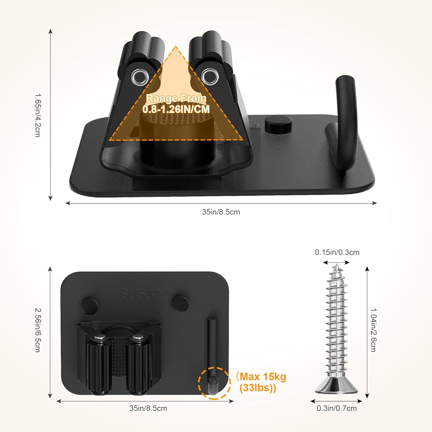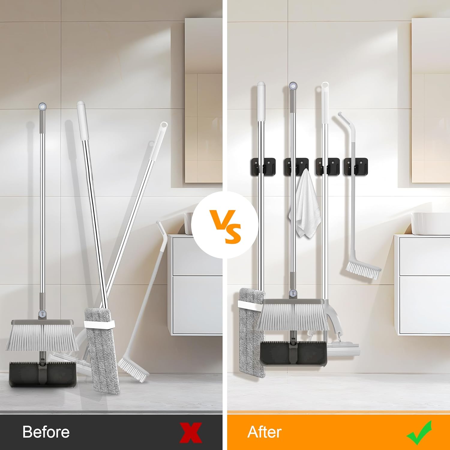 - Economical 4-Pack: This value set includes 4 mop broom holder wall mounted and 10 screws. Spread them across multiple rooms or create a dedicated cleaning station. The elegant black finish complements any décor, offering both functionality and style.