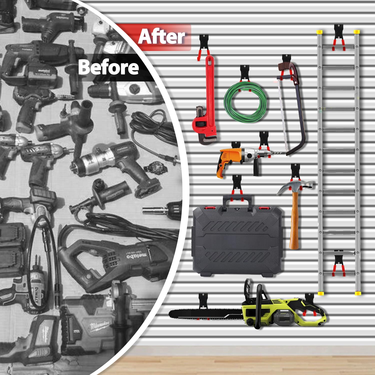 - Multi Sizes Slat Wall Hooks: 14 pcs slat wall accessories in 7 different sizes, including 2 large wave garage wall hooks, 2 media wave hooks,2 large square ladder hooks, 2 medium square hooks, 2 small square proslat hooks, 2 media J hooks and 2 small J heavy duty garage hooks which can accommodate different types of garden tools and equipments. Our ladder hooks for garage wall are designed to meet your daily needs, optimizing space