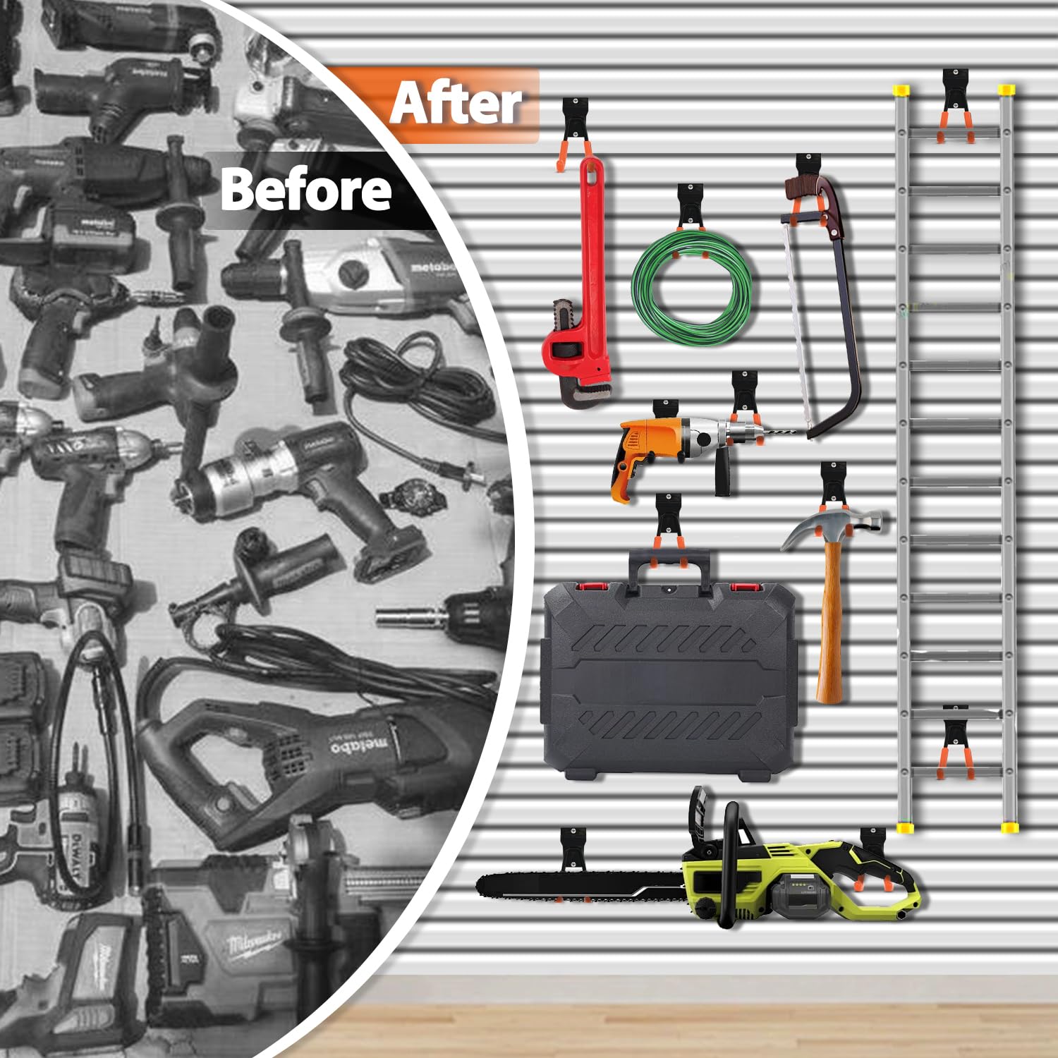 - Heavy Duty Garage Slatwall Accessories Hooks: Slat wall hanging hooks heavy duty are made of thick steel with anti-slip PVC dipping coated preventing the scratching.The sturdy slatwall hooks design provides superior load-bearing capacity, powerful and durable enough to securely hold impact drivers and power tools, such a nice idea tools for hanging