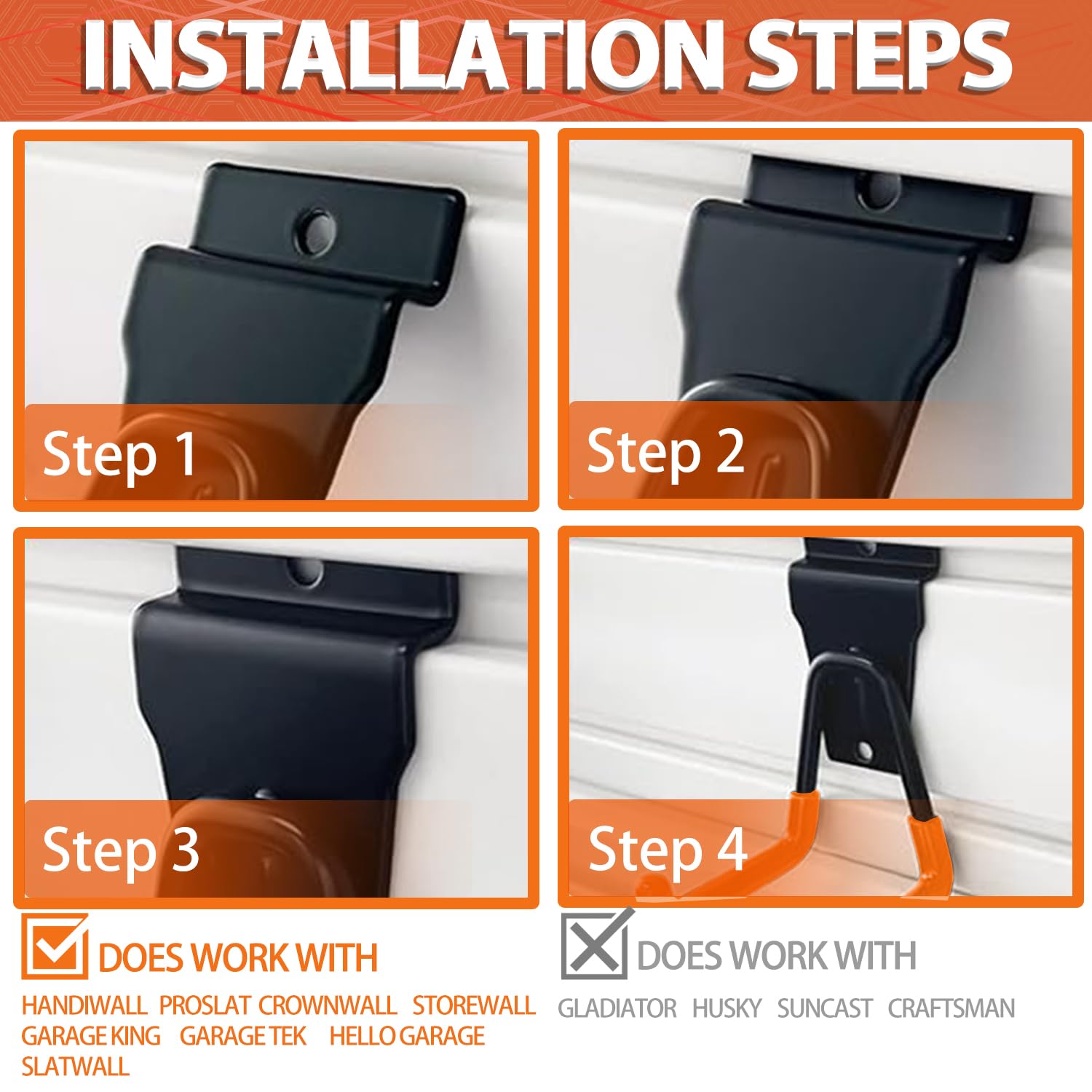 - Easy to Install and Space Saving: slat wall hooks fit standard slat wall like Proslat, Handiwall, Crownwall, etc., you can directly place slat wall hanging hooks to both sides of the panel groove, fix garage hooks for hanging into the groove on the panel then press slatwall brackets down and ladder hook will fit perfectly. Then you can move garage hooks to anywhere you want to put, saving you time and effort