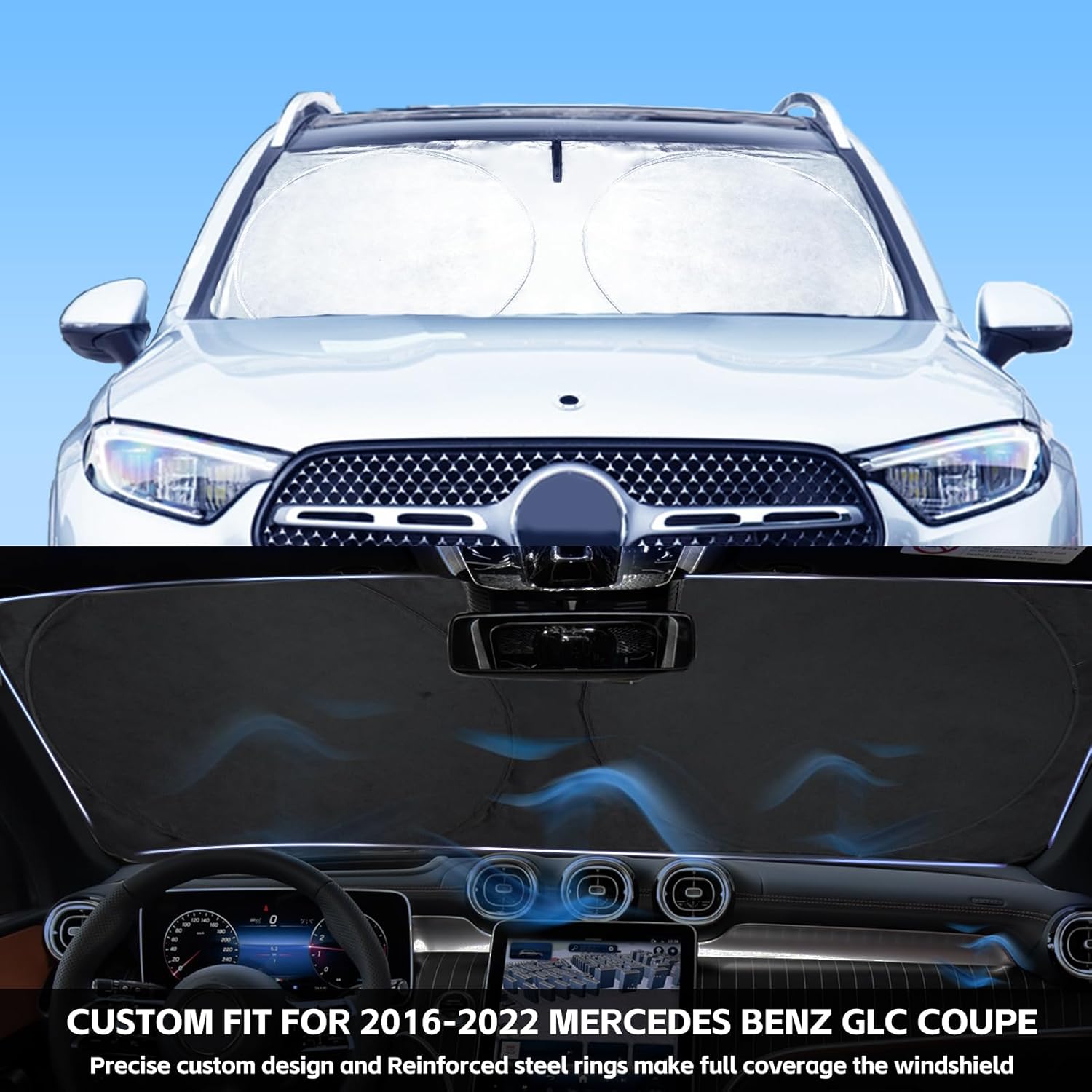- 【Custom Fit for 2016-2024 GLC300】Our windshield shade is specifically customized Compatible with Benz GLC GLC300 and E-Class 2016-2024.This precise fit can perfectly full cover your windshield, is a good choice for your car. (Note : The sliver side is outward,while black side is inward.)Providing the perfect fit to ensure maximum sun protection for your vehicle.