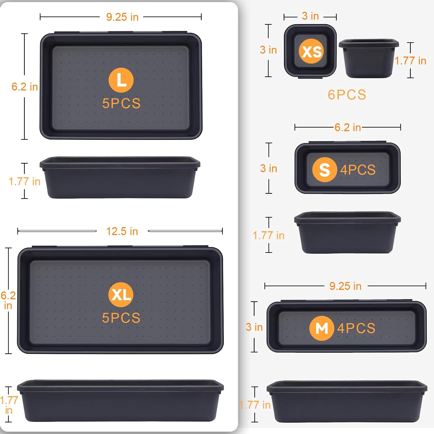 - [24 Pack & 5 Sizes] - Our tool box organizer bins include 24 trays:5 x XL size (12.5x6.2x1.77in), 5 x L size (9.25x6.2x1.77in), 4 x M size(9.25x3x1.77in), 4 x S size(6.2x3x1.77in), 6 x XS size(3x3x1.77in).