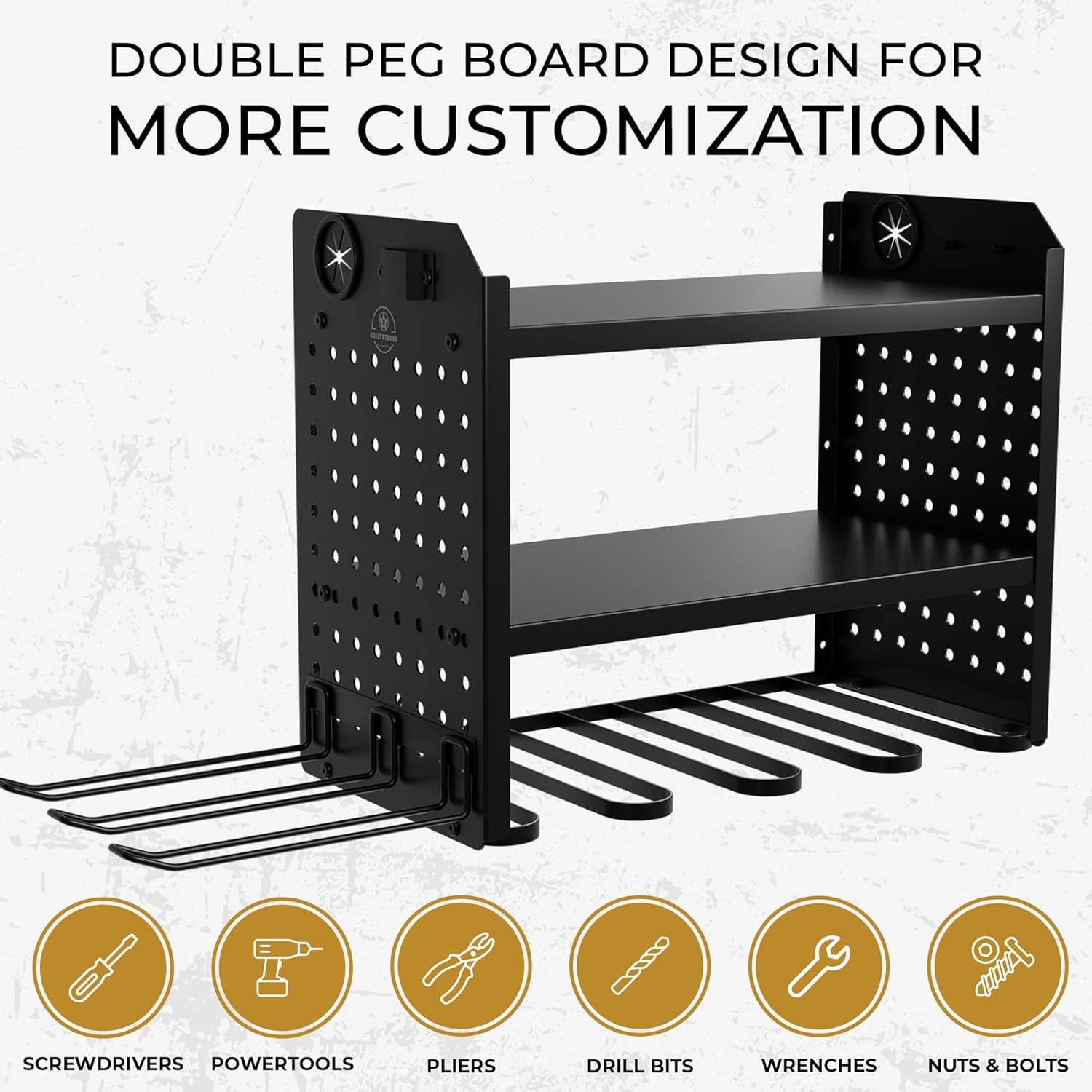 - PROFESSIONAL-GRADE DURABILITY let our tool organizers and storage shelves serve you for years on end. With a high-quality metal construction and beautiful powder-coated finish, this power tool holder stores, organizes, and looks great while doing it.