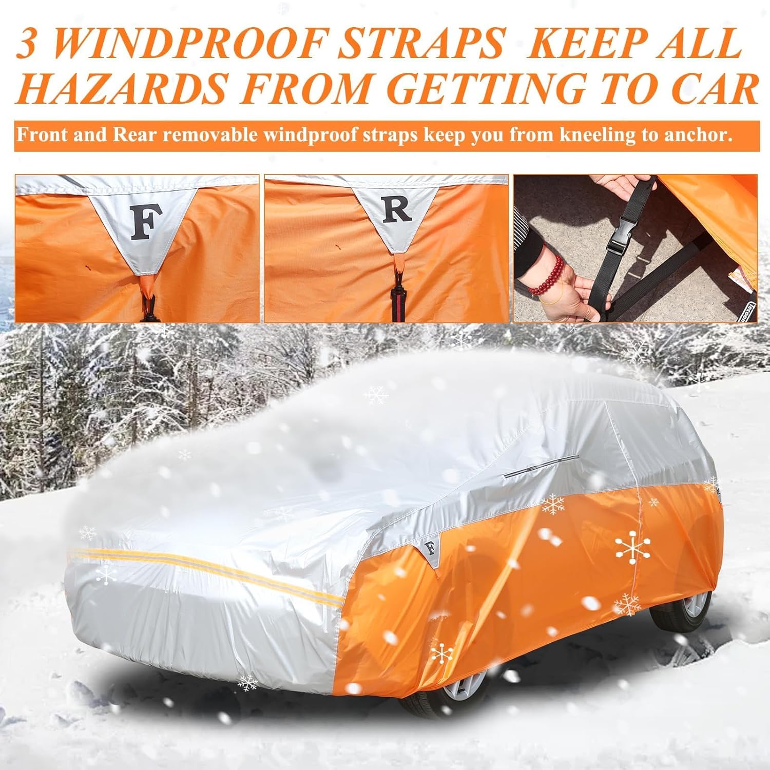 - PROFESSIONAL DESIGN - 1. 3 adjustable car cover windproof straps help to against strong wind, front & rear straps are detachble, center straps connects to the bottom of the car cover. 2. Invisible mirror pockets with waterproof zipper to make the car cover more suitable. 3. Long reflective strips on front and back, night warning to protect your car. 4. The classic driver door zipper design for easy access. 5. High Elastic hem at front and rear, make the car cover fit better