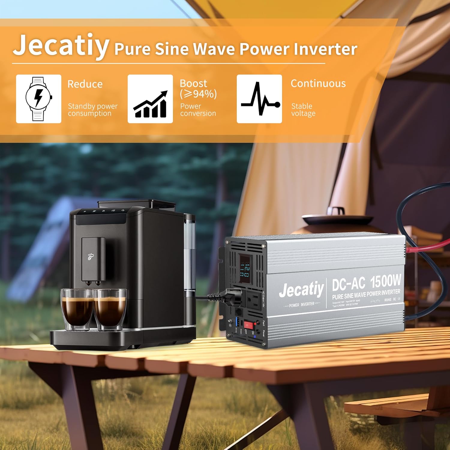 - 【1500W Pure Sine Wave Inverter】Jecatiy upgrade fully 1500W Power Inverter provides a continuous PURE SINE WAVE power of 1500W, with a peak surge of 3000W during load start-up. Tip: It can handle most appliances for you (including refrigerators, microwaves, or some power tools), as well as low-power devices. Note: The voltage of 110V is the actual display, and 100-120V is the supported range of the application
