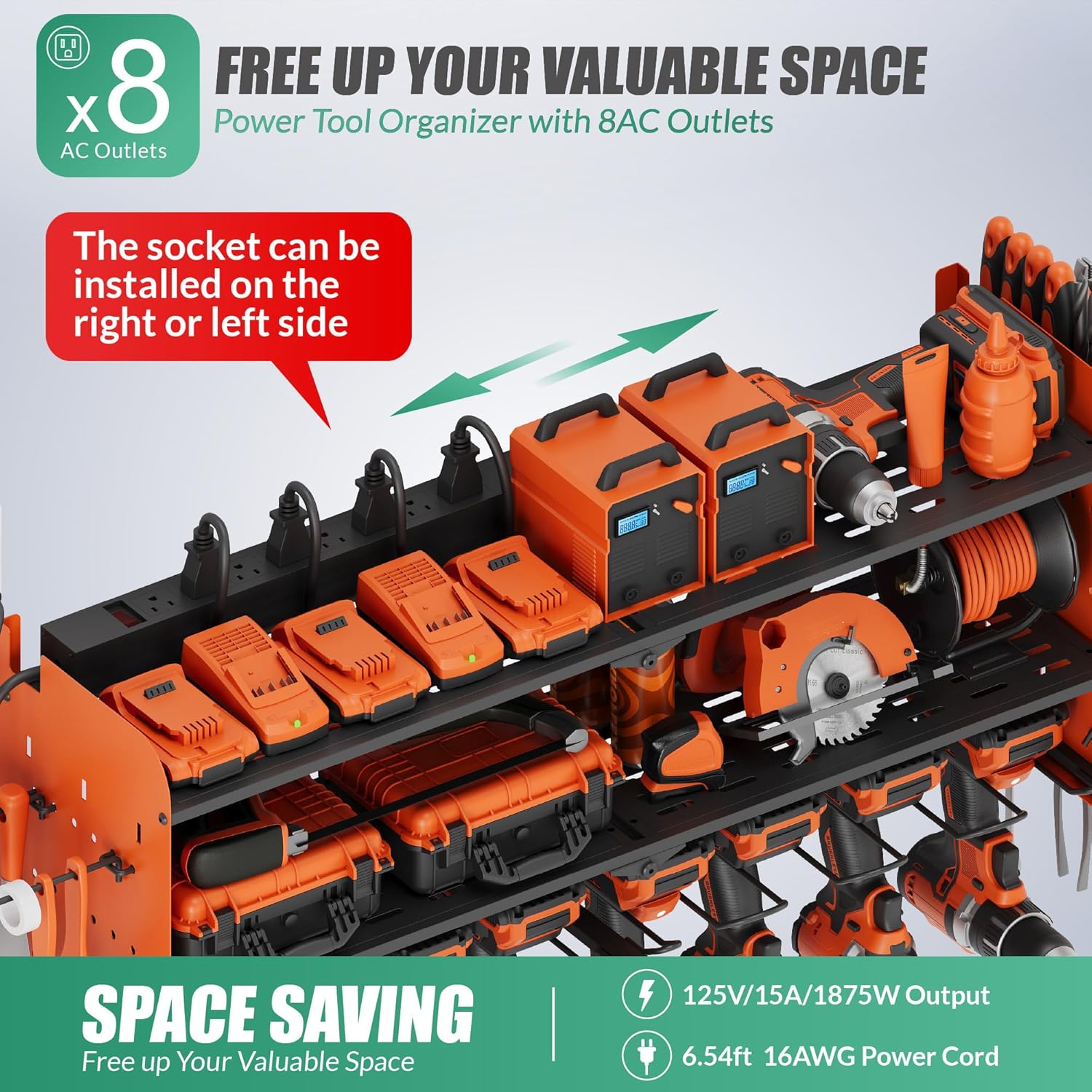 Suchtale Power Tool Organizer with Charging Station,33.2''Garage 8 Drill Holders Wall Mount,3 Layers Heavy Duty Metal Tool Shelf with 8 Outlets Power Strip, Gift for Men, Father, Orange