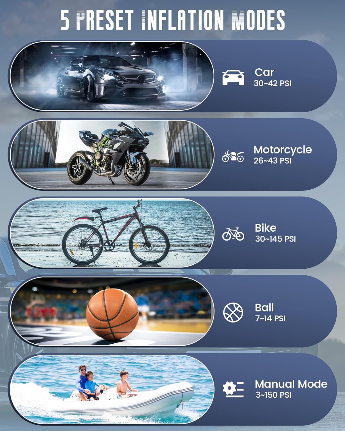 - 🚗[SMART INFLATION & REAL-TIME PRESSURE MONITORING]: The tire pump is equipped with a large LCD, and uses a new generation of high-precision sensors and dual LCD to show real-time and preset pressure values with an accuracy of ±0.5 psi. 4 preset inflation modes for inflating bicycles, motorbikes, cars and balls, automatically stops when the preset value is reached. the manual mode allows you to set the pressure value on demand. 4 units to choose, PSI、KPA、BAR、KG/CM²