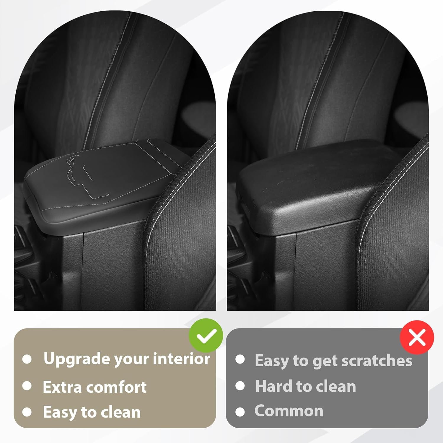 - Unique Design: Designed according to the OEM contour to make it match your vehicle perfectly and even better. Our armrest cover is crafted with high-quality Vegan Leather and an extra layer of foam, which is skin-friendly, breathable and soft.