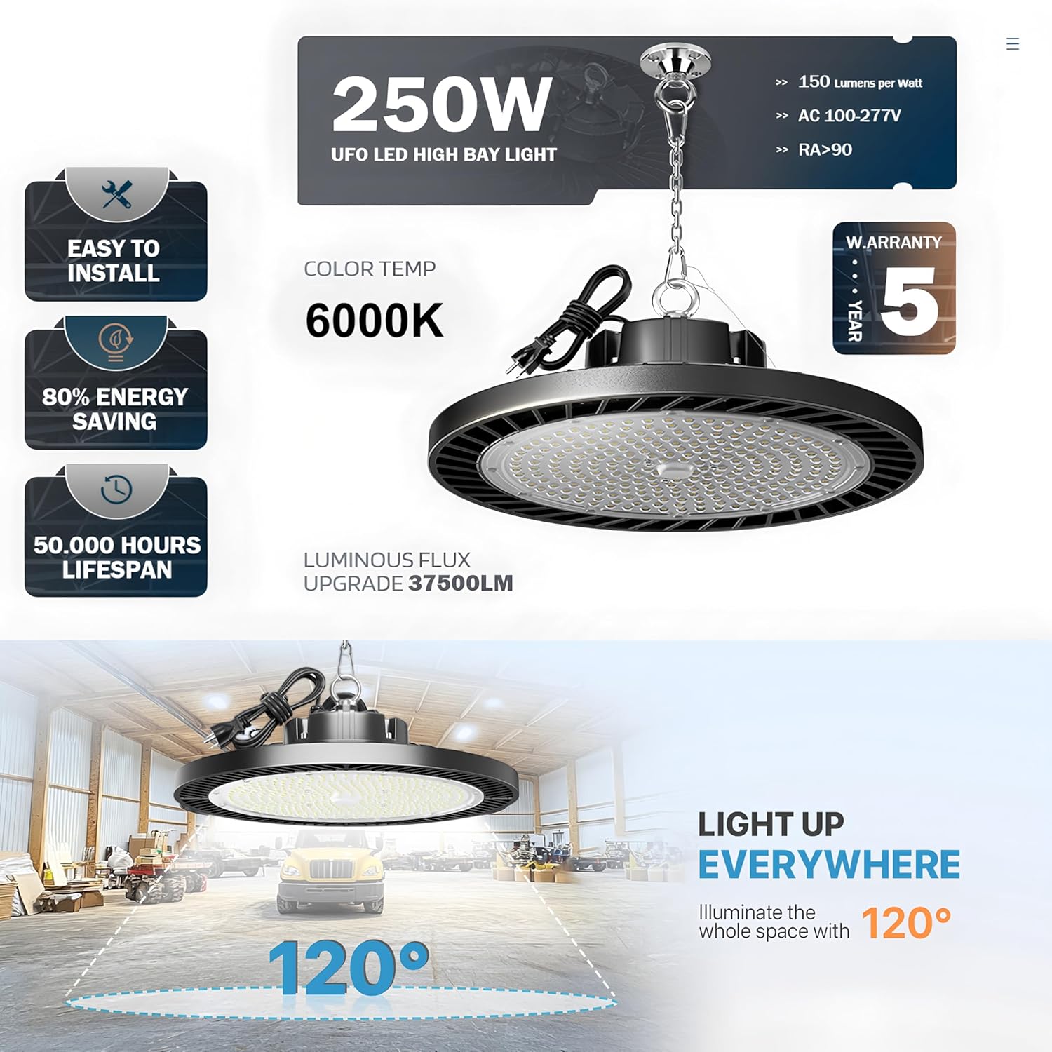 - ✔️【Super Bright&Energy Saving】250W LED high bay garage light are use high brightness SMD3030 LED with total 30000lm, Eqv.to 2500W HIP fixture, energy saving up to 80% on your electricity bill. 6000K daylight provides clear and bright lighting effect.