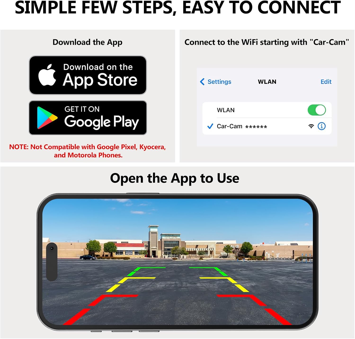 - 【Easy 1Min Installation】Say goodbye to complex setups! Our wifi backup camera offers effortless installation in just 3 simple steps: download the app, connect to WiFi, and view the image on your phone or tablet. No drilling, no wiring required. (NOTE: Not compatible with Google Pixel, Kyocera, and Motorola phones)