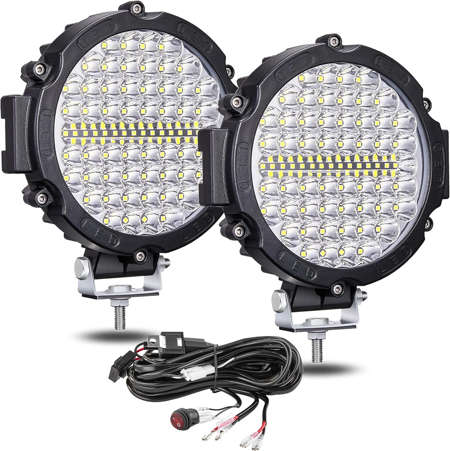 - 【Pack Includes】2 packs of 7 in round LED off-roading lights, 2 kits mounting brackets. 1 Kit 3 meters Wiring Harness