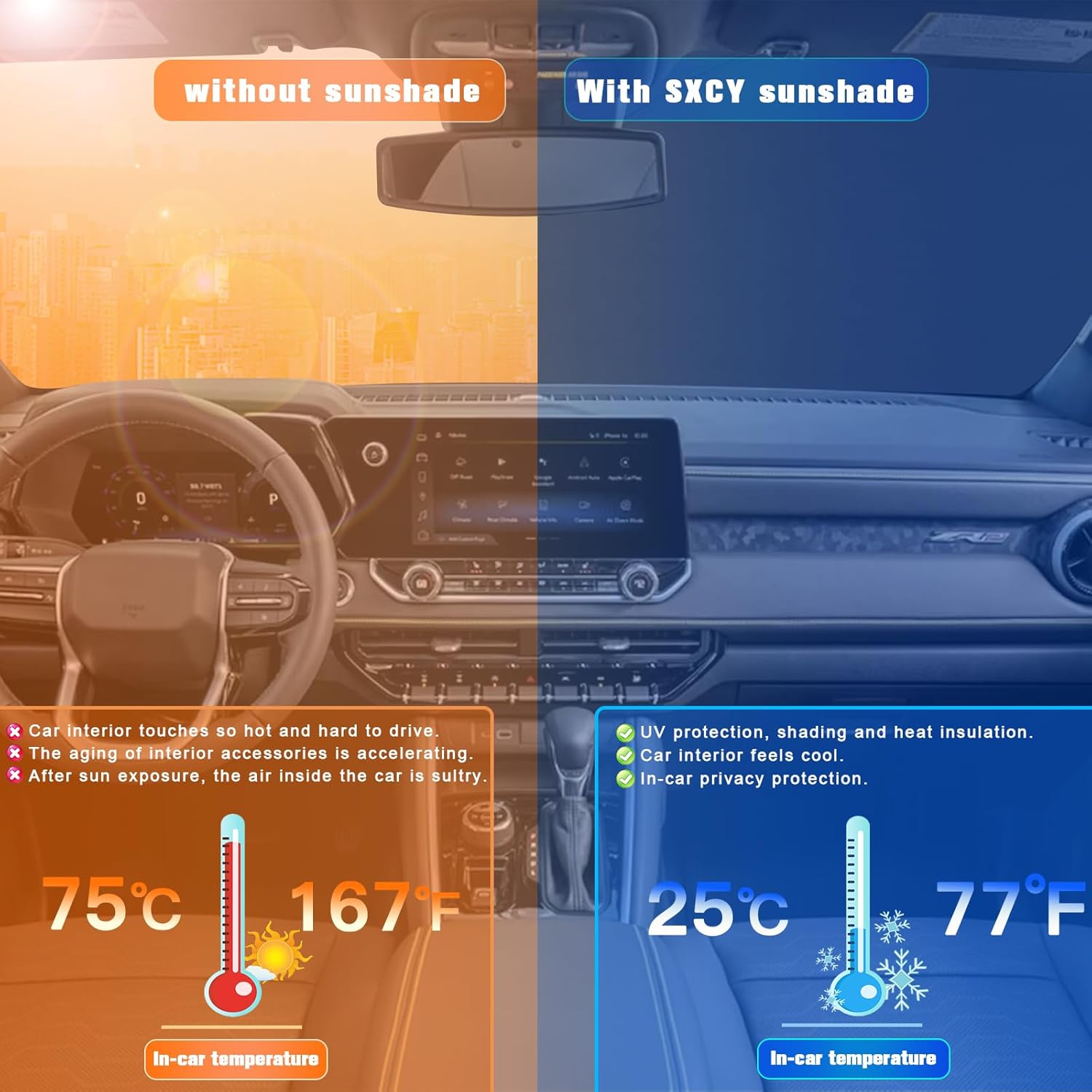 - 2.Sun Protection: Solve your concerns about parking for a long time under the scorching sun,prevent the car's interior from getting sunburned and extend your car interior accessories’life.