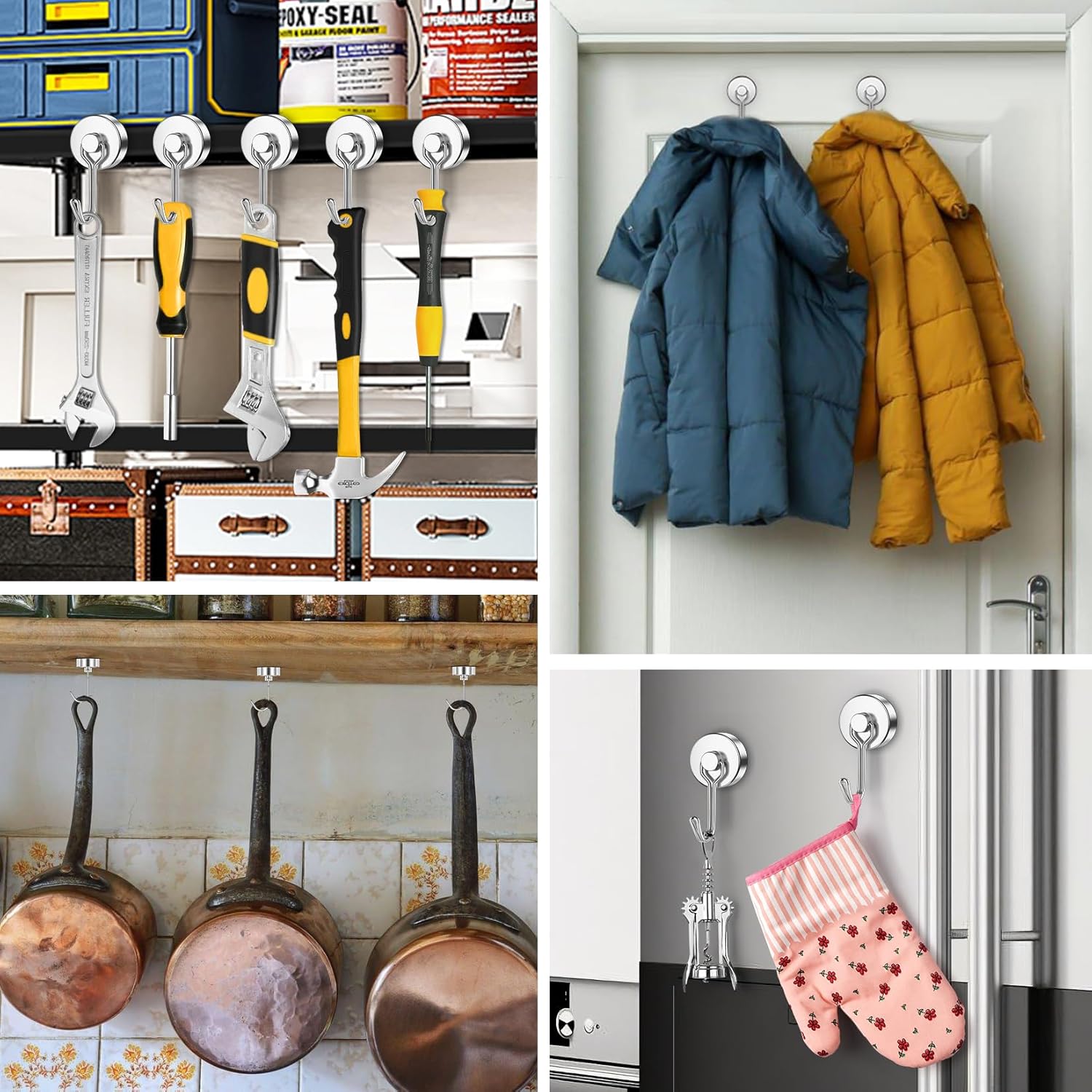 - Durable Build with Polished Finish: Crafted with N52 Grade neodymium magnets and a steel base, each hook features a mirror-like nickel coating that resists rust, corrosion, and scratches. The sleek finish not only adds durability but also maintains a clean, professional look for long-term use.