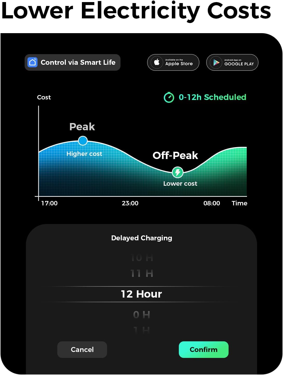 - 0-12 hours Scheduled: The EV charger level 2 supports a maximum current of 40A, compatible with NEMA 14-50 plug. The smart Level 2 EV Charger supports a scheduled charging function, allowing you to charge during off-peak hours when electricity rates are lower, thus saving on charging costs. Additionally, it helps you avoid peak charging times, enhancing charging efficiency. This provides your electric vehicle with a more economical and convenient charging solution.