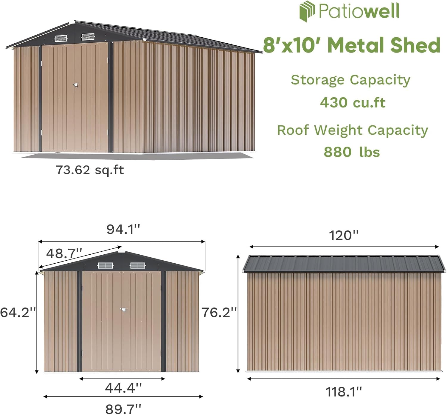 Patiowell 8x10 FT Outdoor Storage Shed, Large Garden Tool Metal Shed with Sloping Roof and Double Lockable Door, Outdoor Shed for Backyard Garden Patio Lawn, Brown