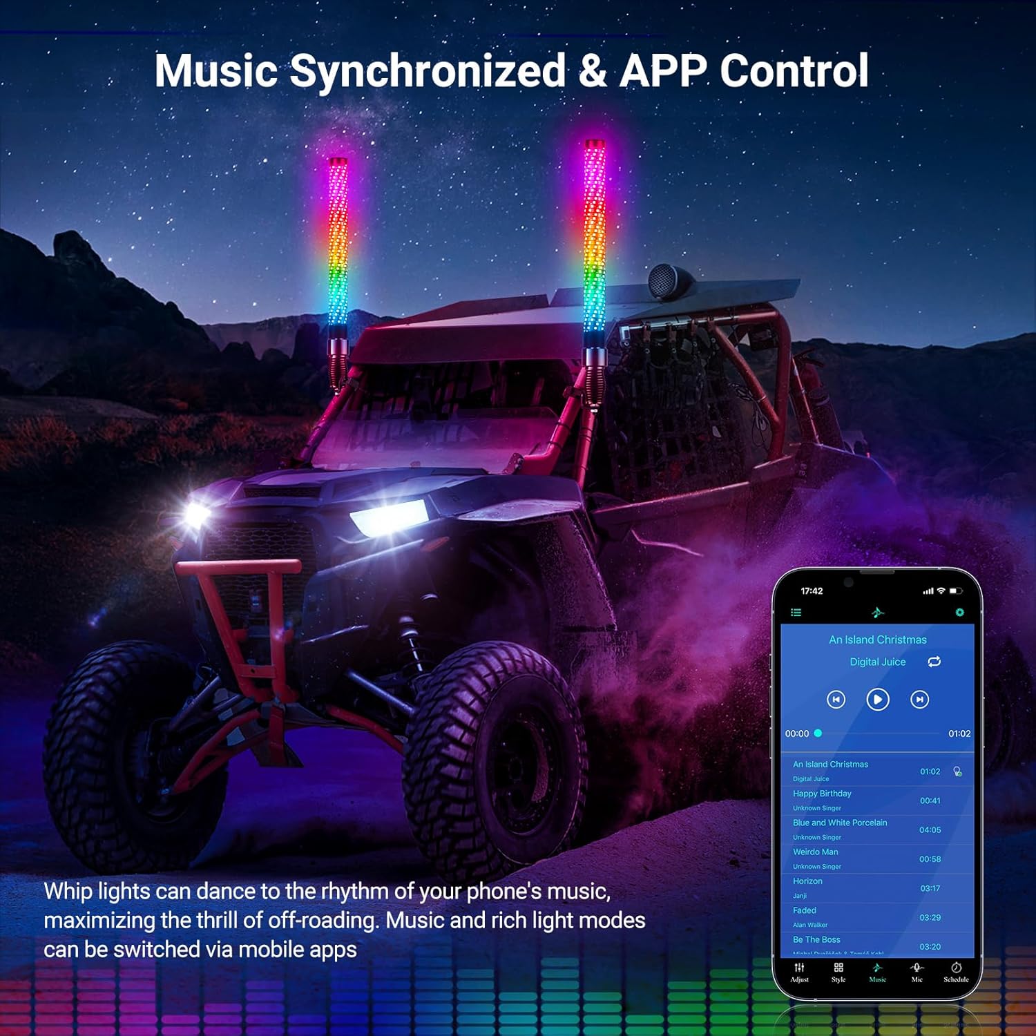 - 【Dual Control and Personalize】Featuring countless built-in colors and 366 customizable patterns, these whip lights can stream, strobe, cascade, chase, pulse, and more. They are controllable via an app or remote control, allowing users to personalize the light modes, adjust brightness, and set the movement speed to enrich your off-road trip