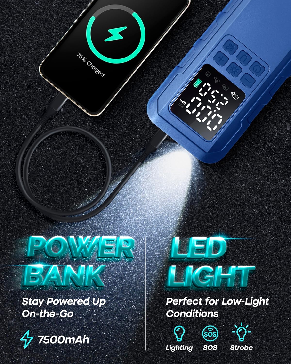 - LCD DISPLAY and LED LIGHT:This LCD display of car tire pump will show you the actual pressure,unit display,preset pressure,battery indicator, mode display and make the inflation to be easy.The LED light on top of air pump offer you illumination in dark night or any emergency