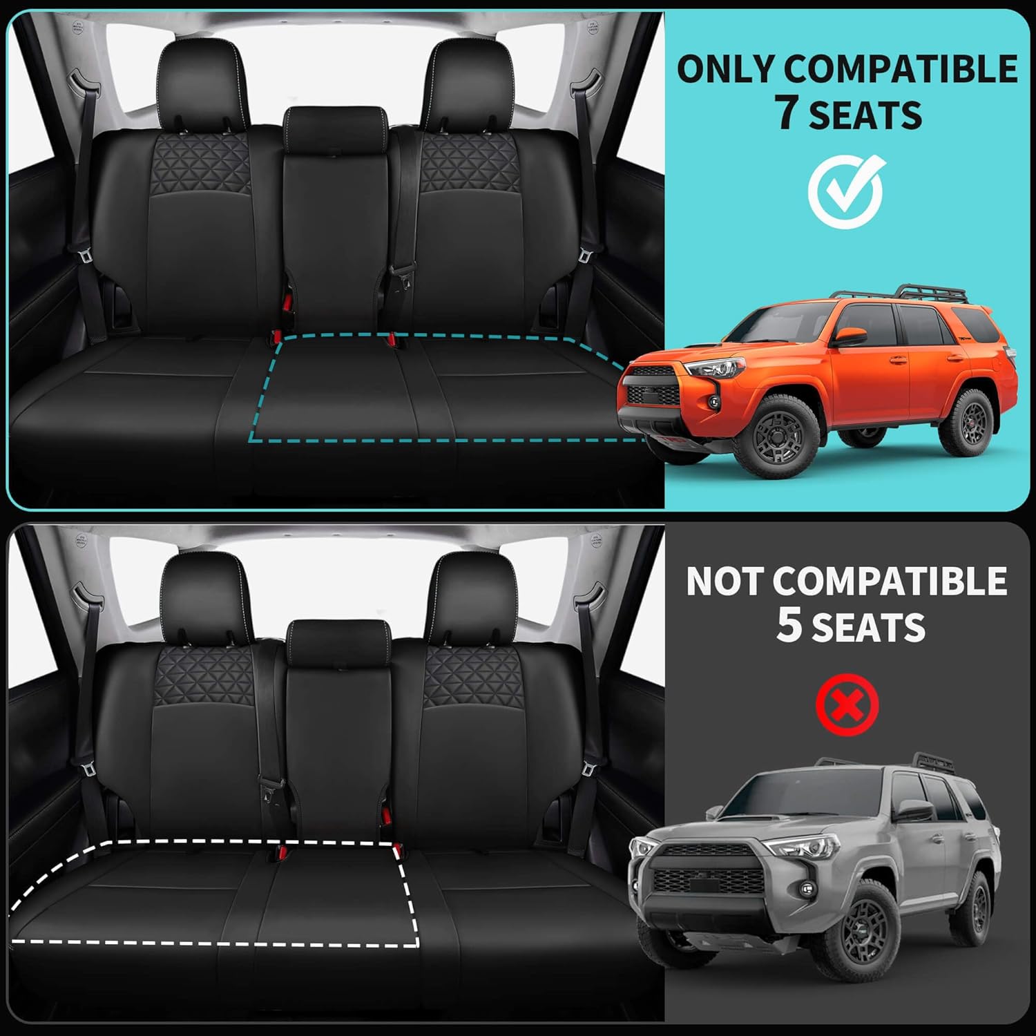 - Compatible with 7 Seats & 3 Rows - Car seat covers are tailored to fit 7-seat and 3-row versions, with a 40/60 split for 2nd row. Fit for 7-seat 4Runner models from 2011 to 2024, and are not compatible with the 5-seater and 2-row versions