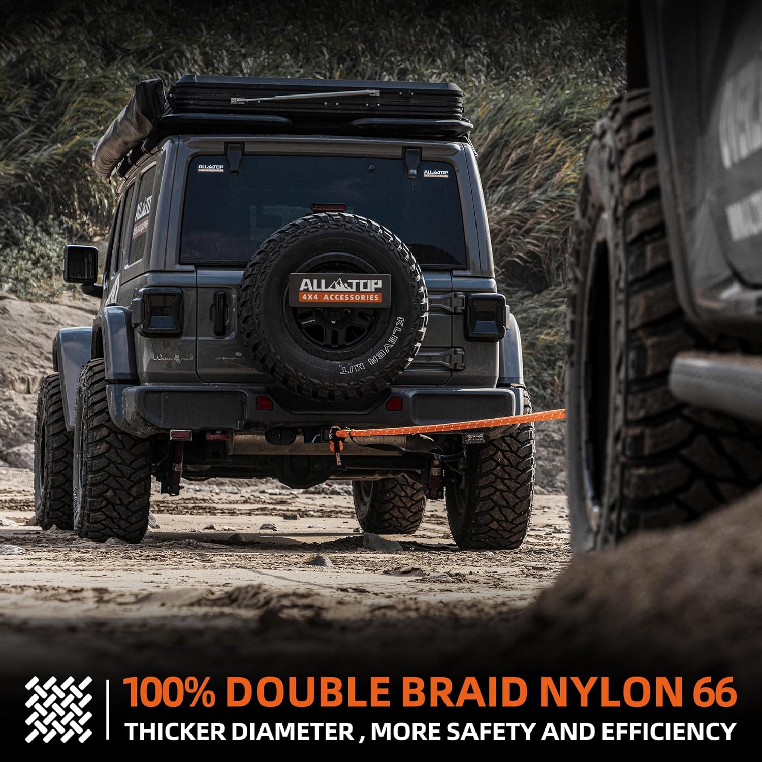 - 【RECOVERY MUST-HAVE】 ALL-TOP Reflective Kinetic Rope is one of the most reliable overlanding gear you should have to safeguard your offroad trips. Double braided with 100% Nylon & Coated with Mil-spec Polymers, provides trustable 48000Lbs Break Strength Rating & 16000Lbs Work Load Limit. Innovatively weaving with Reflective Ribbon enhance your recovery visibility & safety in dark.