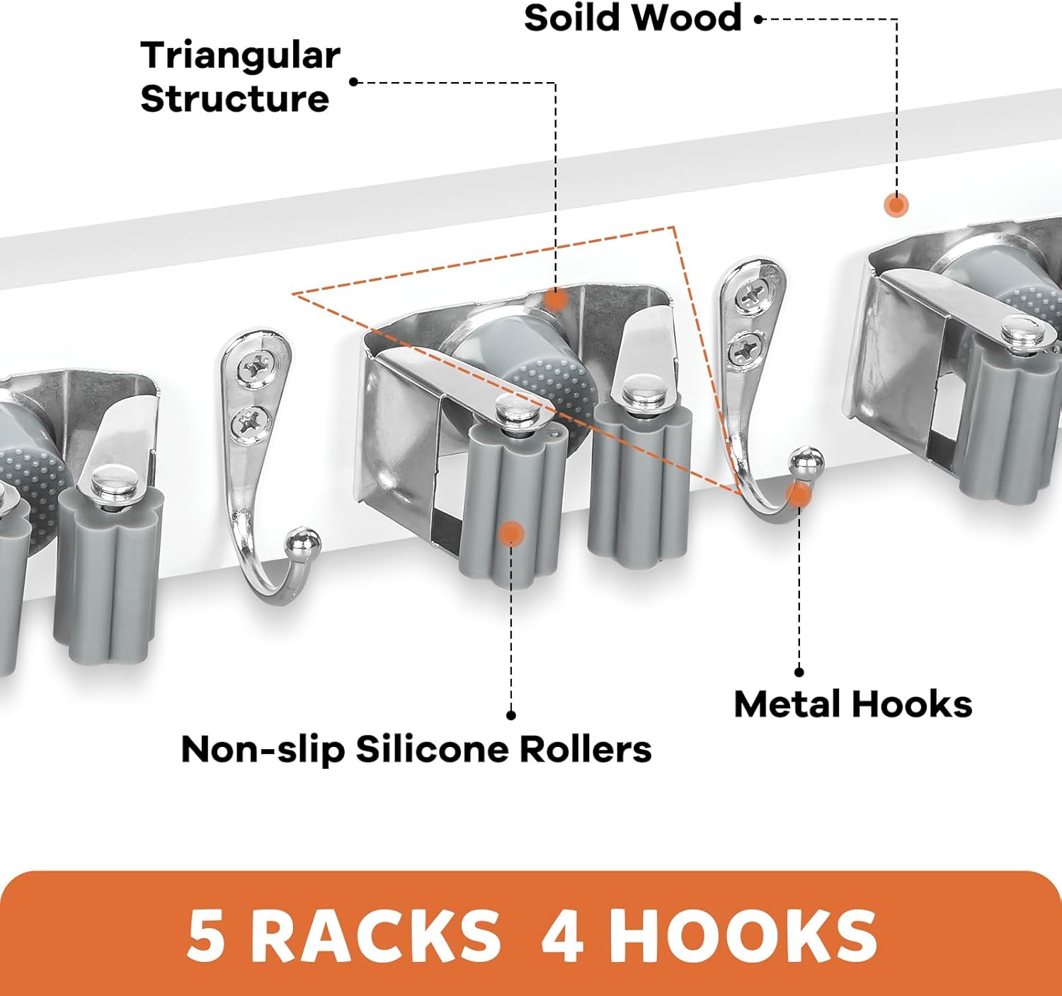 IMILLET Broom Holder Wall Mount, Wood Broom Holder with 5 Racks and 4 Hooks Broom Organizer, Laundry Room Organization and Storage, Mop Hanger for Home Organization, Garden, Garage, Closet (White)