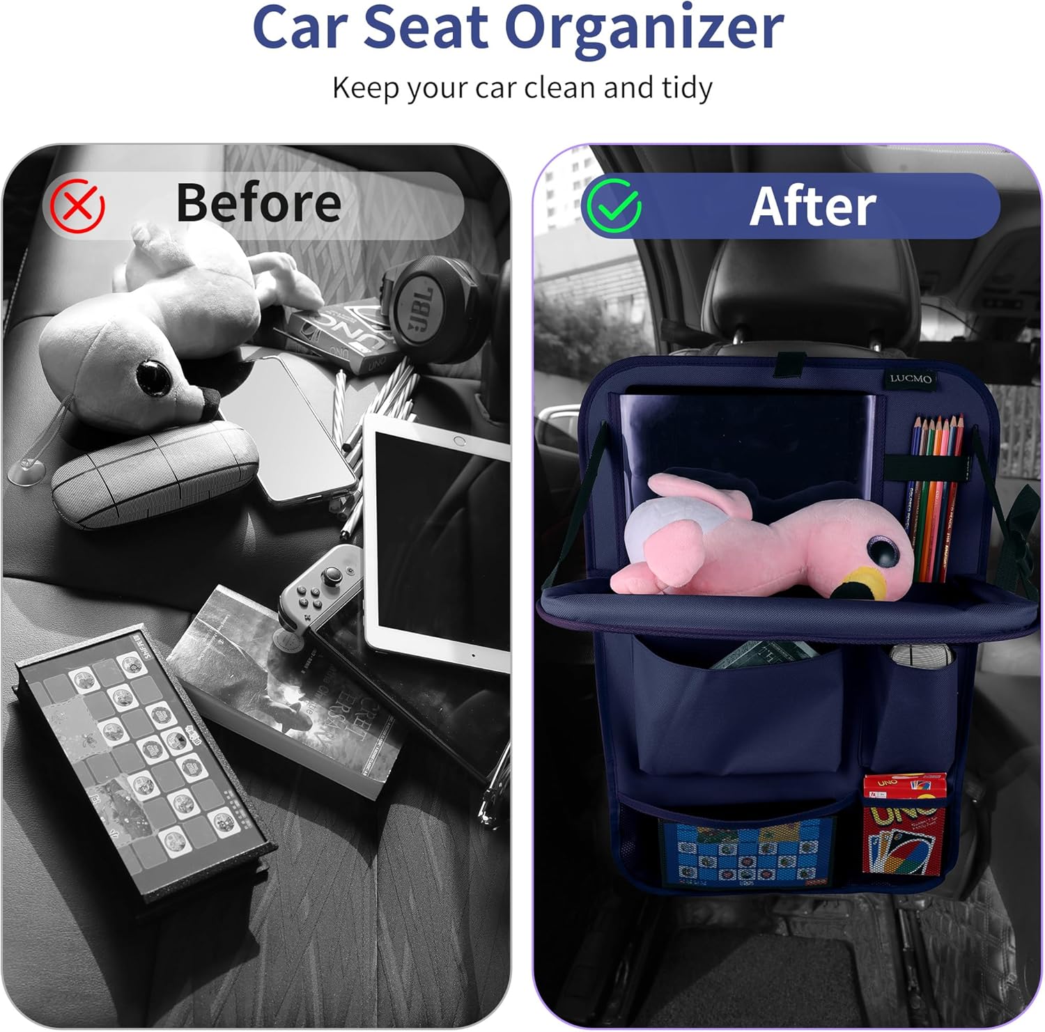 LUCMO Car Backseat Organizer with Tablet Holder-2 Pcs,6 Storage Pockets Car Storage Organizer with Foldable Food Tray,Protectors Kick Mats Travel Accessories-Dark Blue