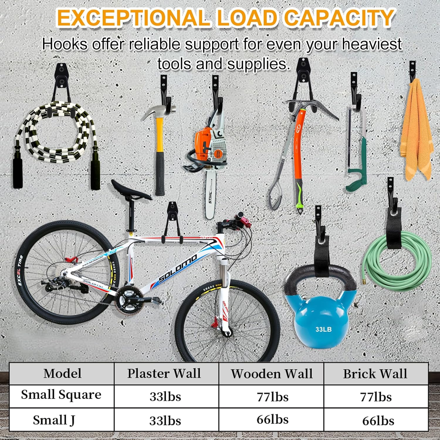 - Excellent Load-bearing Performance: The garage storage hooks own superior weight-bearing capability for your heavy-duty storage needs; depending on the wall material, small square hook holds 33 lbs to 77 lbs; small j hook holds 33 lbs to 66 lbs