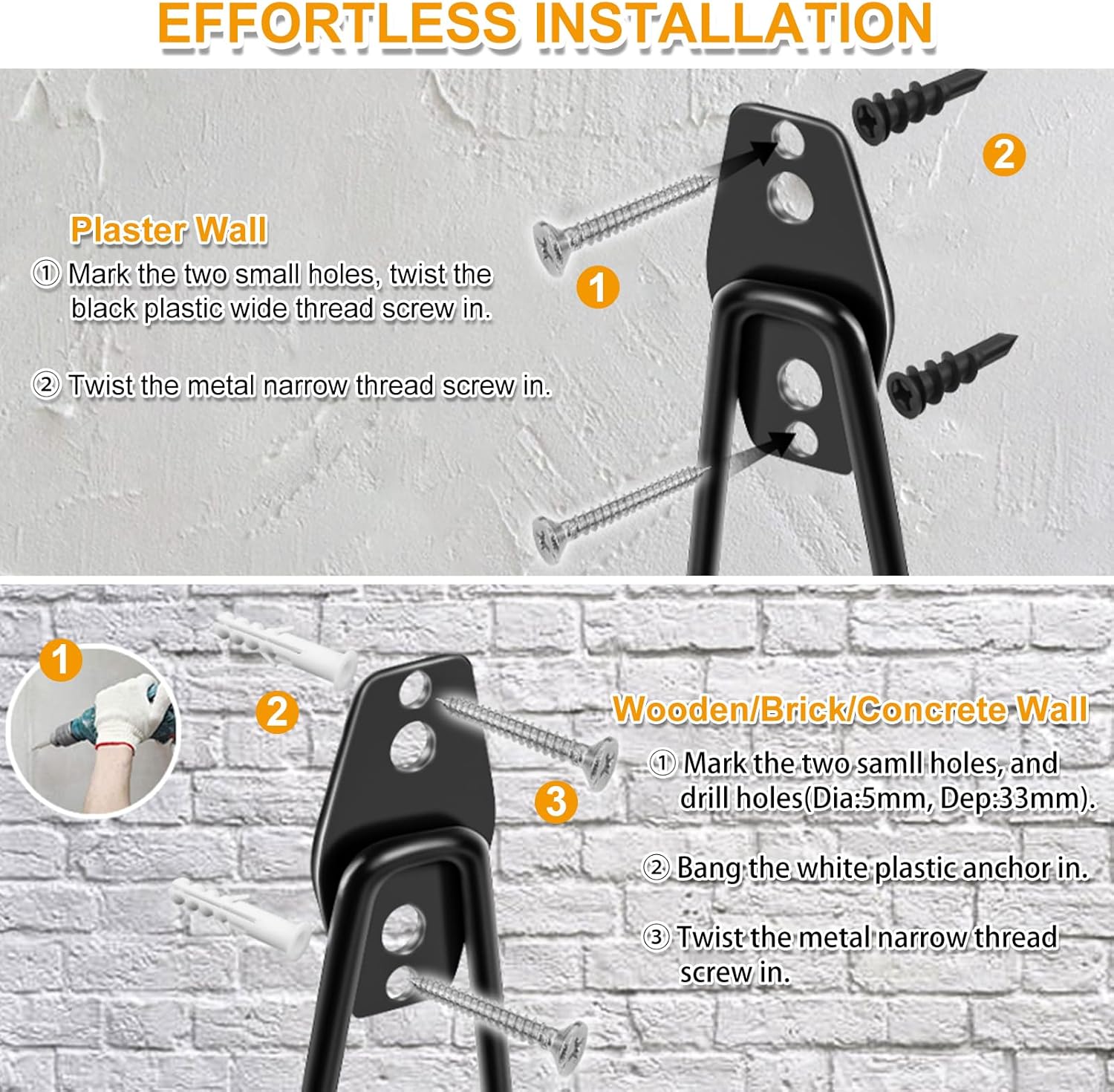 - Quick and Easy to Install: These steel garage wall hooks are suitable for plaster, wood, brick, and concrete walls; mark the hole positions of the hook, drill holes, nail in the plastic anchors, align the hook positions and then drive in the screws