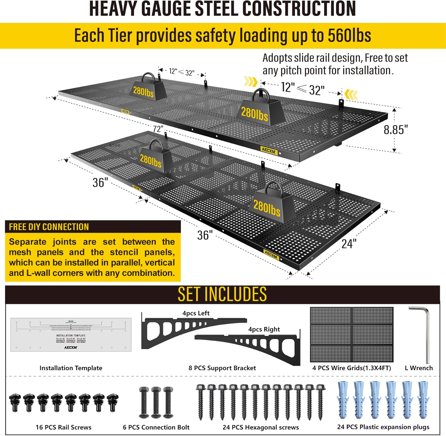 - Premium Craftsmanship: This garage wall shelving is crafted from a single steel sheet, precision-stamped and folded for strength. Unique high-density hole design enhances functionality while delivering a sleek, modern aesthetic