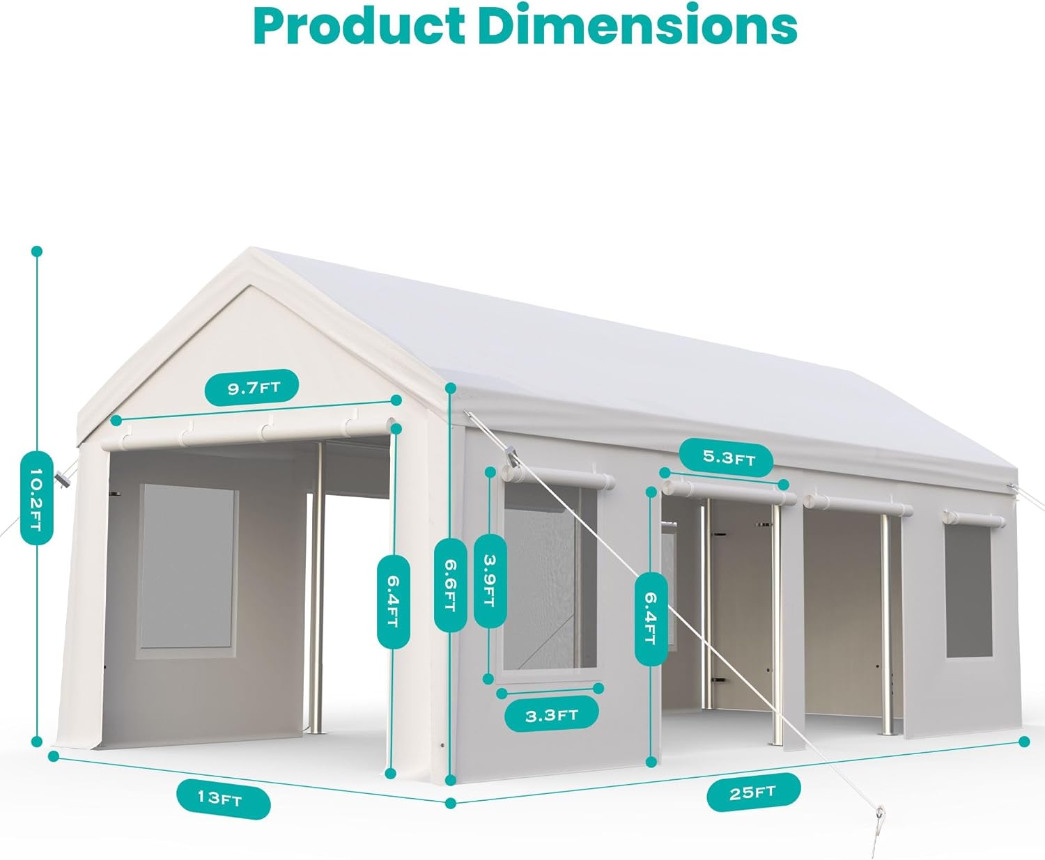 13x25ft Carport, Heavy Duty Carport with Reinforced Steel Poles, Upgraded Portable Garage with Doors & Window, UV Resistant All-Season Waterproof Tarp, for Car, Truck, Boat(White)