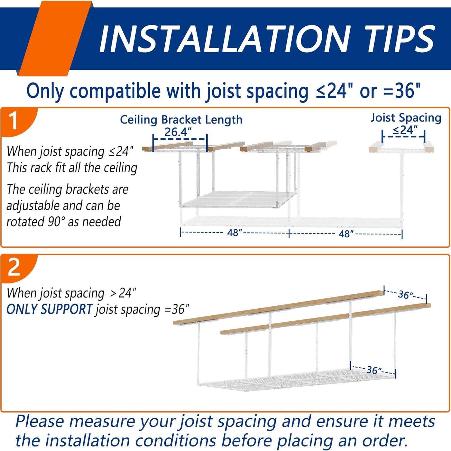 - ADJUSTABLE HEIGHT: Our garage storage racks are height adjustable,giving you the freedom to adjust the distance between the rack and the ceiling from 22 inches to 42 inches. This 3 FT x 8 FT ceiling mount rack adds up to 82 cubic feet of storage space.