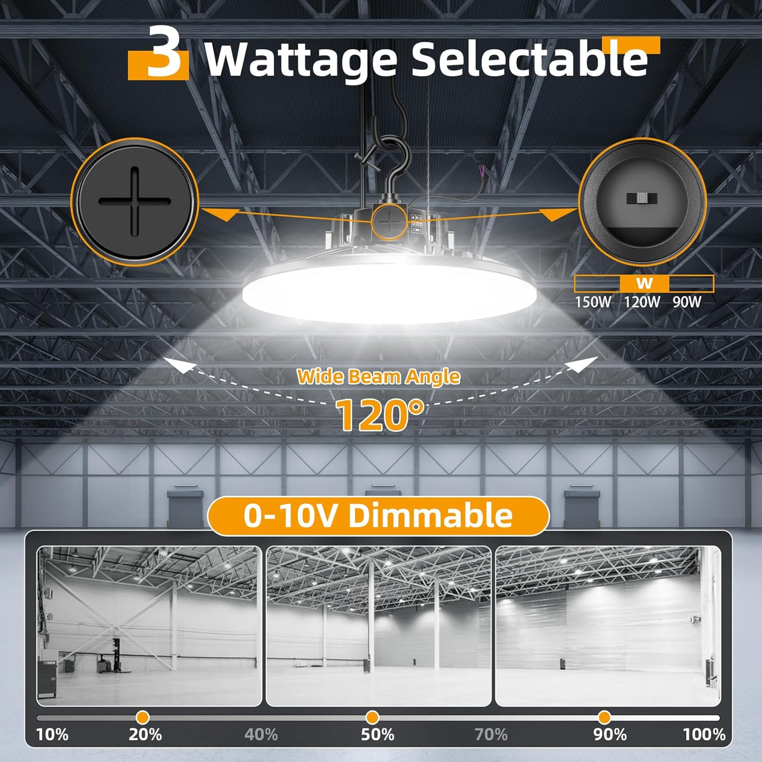 - 【Dimmable Compatibility & Flicker Free】The dimmable high bay led shop lights have smooth dimming range from 10-100%, which allows you to adjust the brightness of the lights according to your needs. The CRI>80 Industrial LED Ceiling Light makes colors in your room appear richer, true and natural, and the 120° beam angle ensures the biggest coverage area! It can be an efficient high bay led lighting, or be a temporary work lighting. No buzzing, no humming, and no flickering.