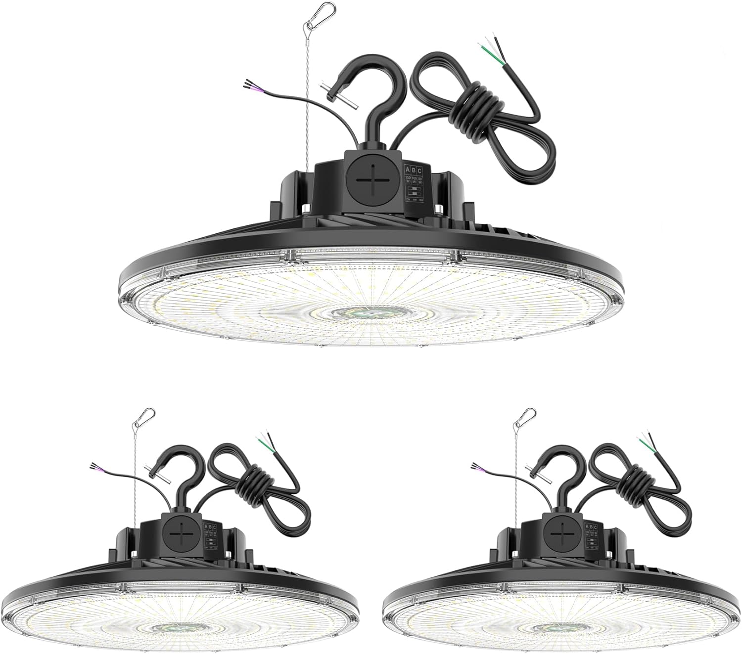 - 【3 Wattage Selectable】Using our led high bay light is equivalent to having 3 brightness LED lights 300W/240W/200W, which is equivalent to providing 42,000 lumens/33,600 lumens/28,000 lumens. Simply slide the switch to select the perfect wattage and color temperature before installation to meet your different needs in warehouse, workshop, factory, garage, barn and other industrial and commercial places.